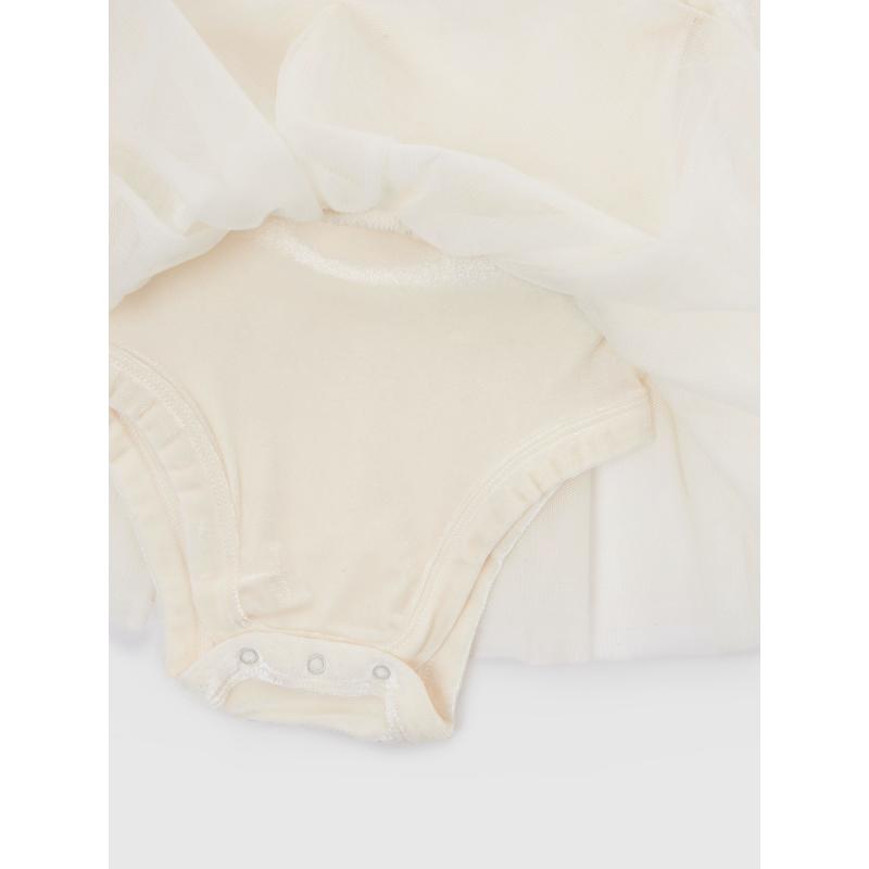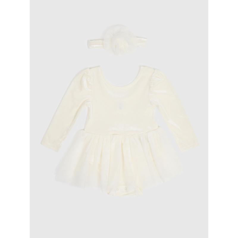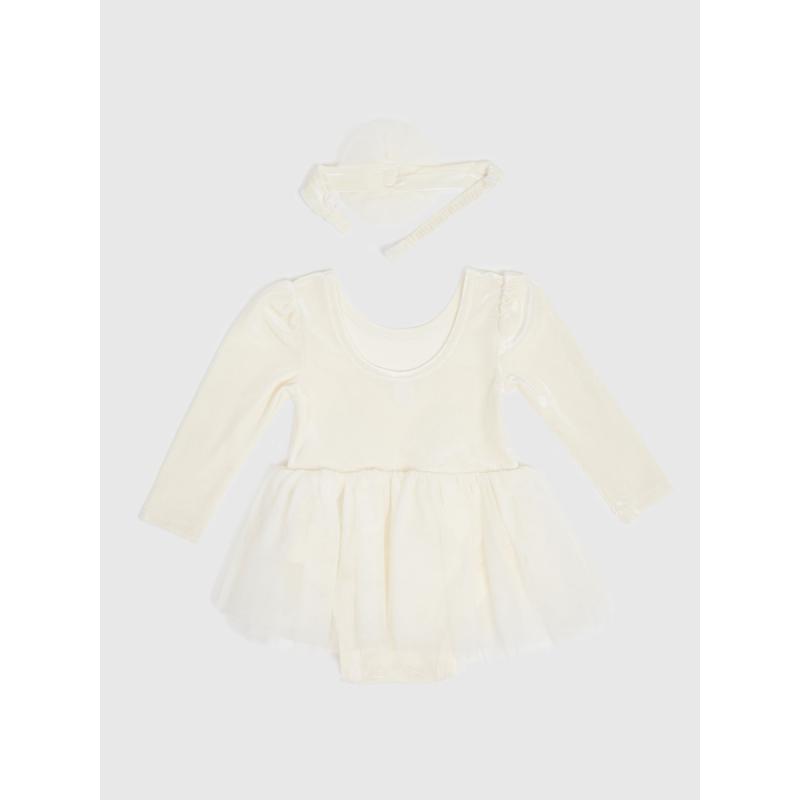 Dětské sametové body.Se sukní a čelenkou.Kulatý výstřih a dlouhé rukávy.Zapínání na druky.Tylová sukně. 95 % polyester, 5 % elastan