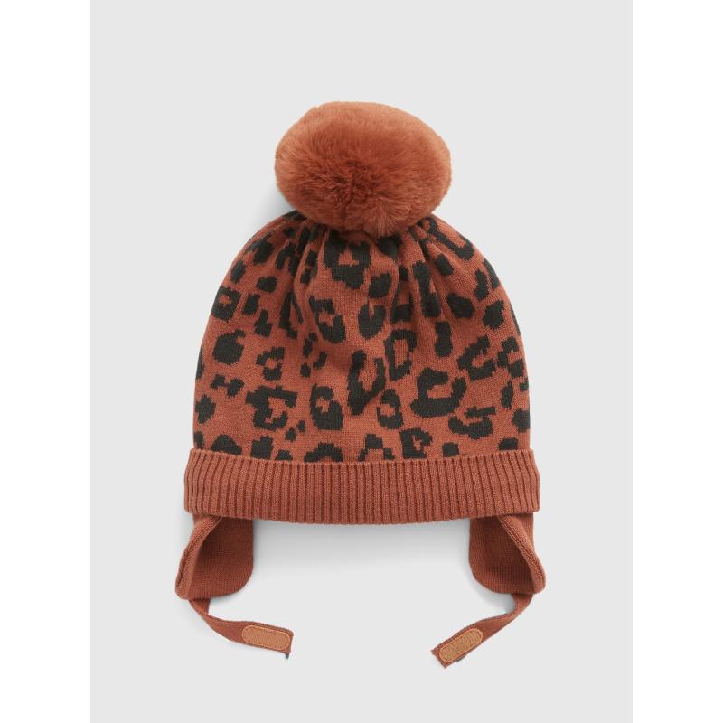 Dětský pletená čepice s bambulí.Plošný vzor leopard.Pružný žebrovaný lem.Hřejivá ochrana uší a zapínání pod bradou.100% bavlna. 100 % bavlna