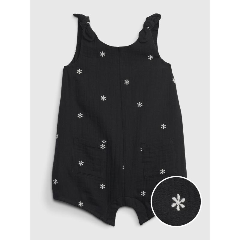 Hladký krátký overal z lněno-bavlněné tkaniny.Kulatý výstřih, hlubší zadní výstřih.Ramínka s vázáním na ramenou.Na bocích našité kapsy.Cvočky v rozkroku pro snadné oblékání a přebalování. 55 % len, 45 % bavlna