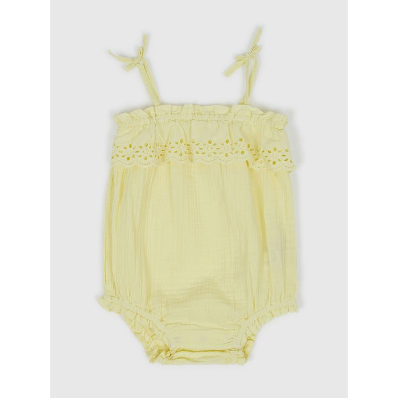 Dětské body z měkkého mušelínu.Zavazování na úzká ramínka.V horní části pružné.V nohavičkách zapínání na patentky. 100 % bavlna