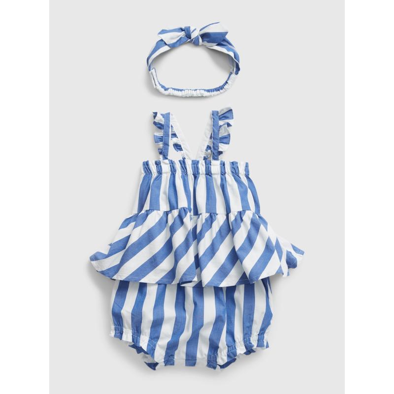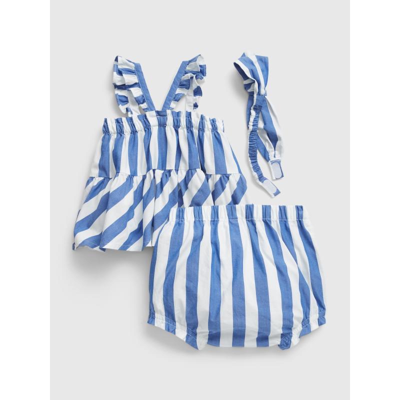 Dívčí pruhovaný outfit.Set se skládá z topu, kraťásků a čelenky do vlasů.Peplum top s ramínky s volánky.Kraťásky s pružným pasem.Čelenka s mašličkou. 100 % bavlna