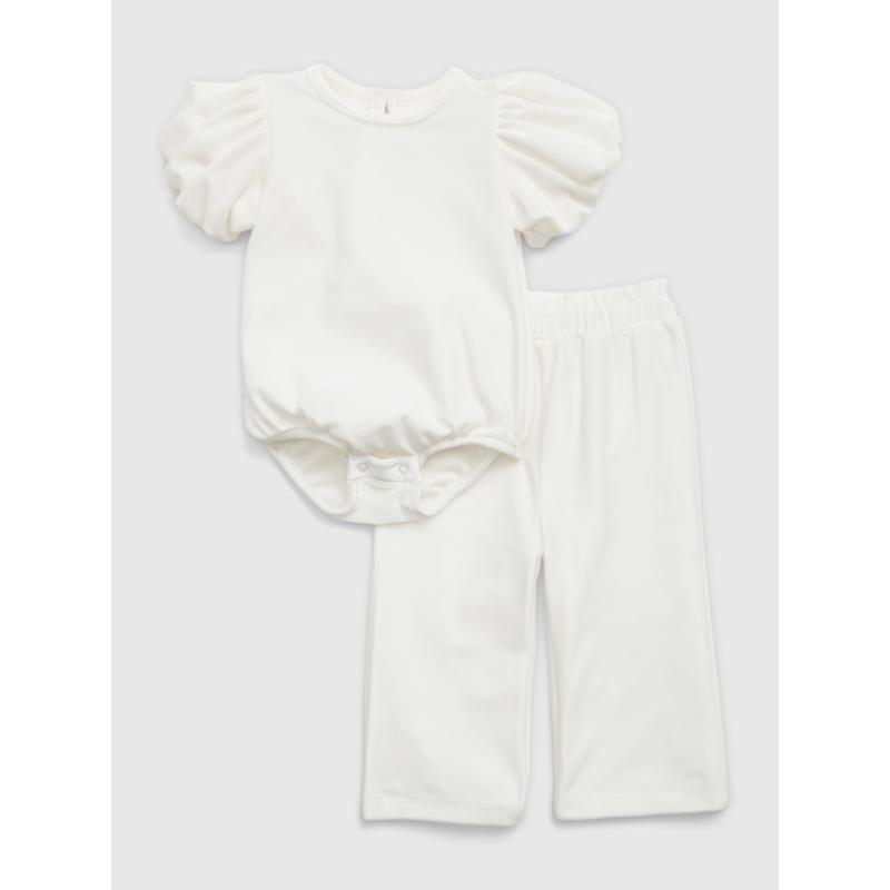 Dětský sametový set.Body s nabíranými rukávy.Kulatý výstřih a zapínání na druky.Široké kalhoty s pružným lemem.Jednobarevný. 94 % polyester, 6 % elastan