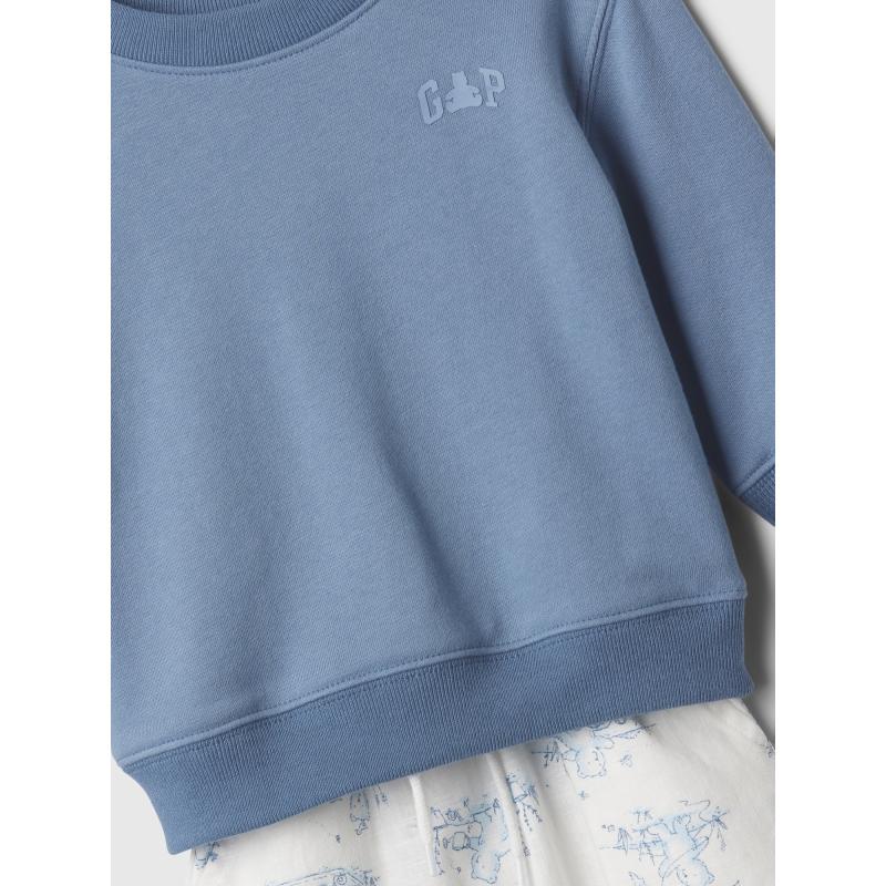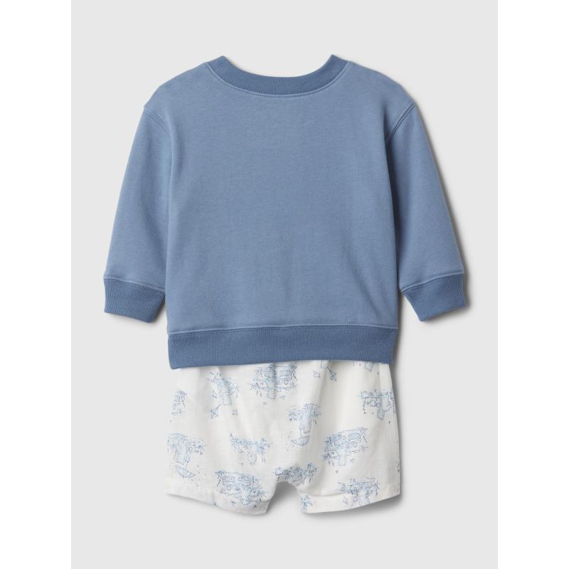 Mikina a kraťasy pro miminko.Modrá mikina s logem.Dlouhé rukávy a kulatý výstřih.Pružné žebrované náplety.Lněné vzorované kraťasy.Pružný pas se stahovací šňůrkou. Mikina: 77 % bavlna, 23 % polyester; Kraťasy: 55 % len, 45 % bavlna