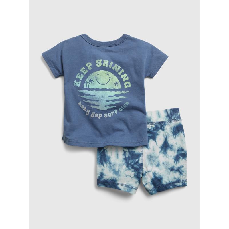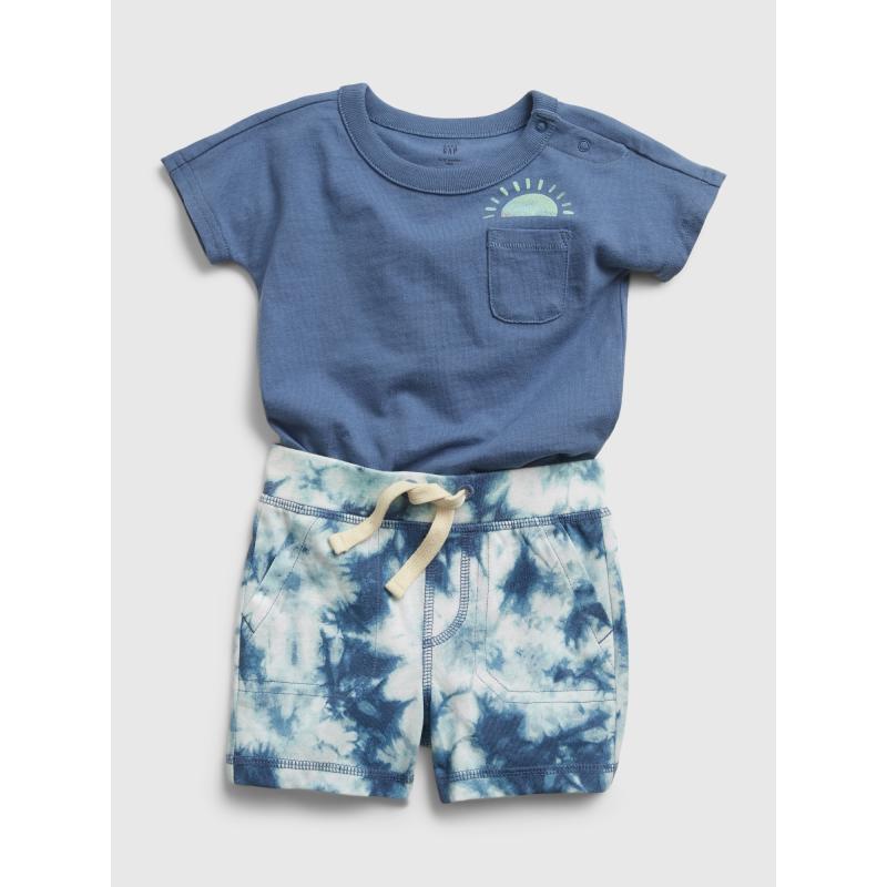 Dětský set.Komplet se skládá z trička a kraťasů.Jednobarevné tričko s krátkým rukávem.Na hrudi kapsička.Na zádech obrázek a nápis.Batikované kraťasy s pružným pasem.100% bavlna. 100 % bavlna