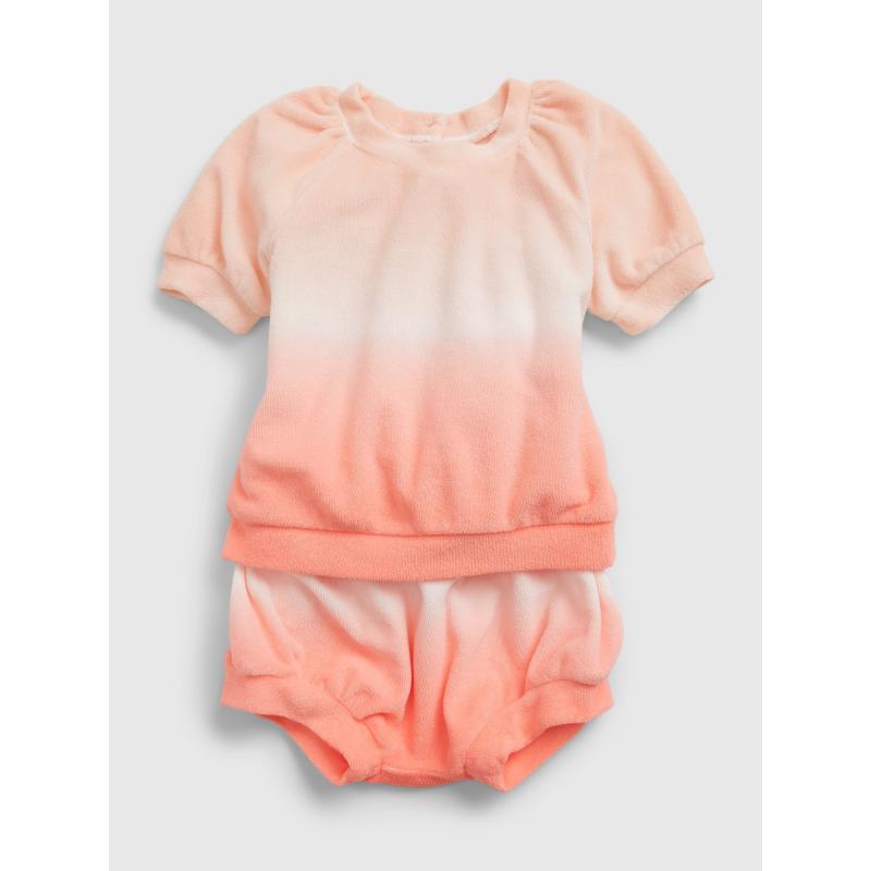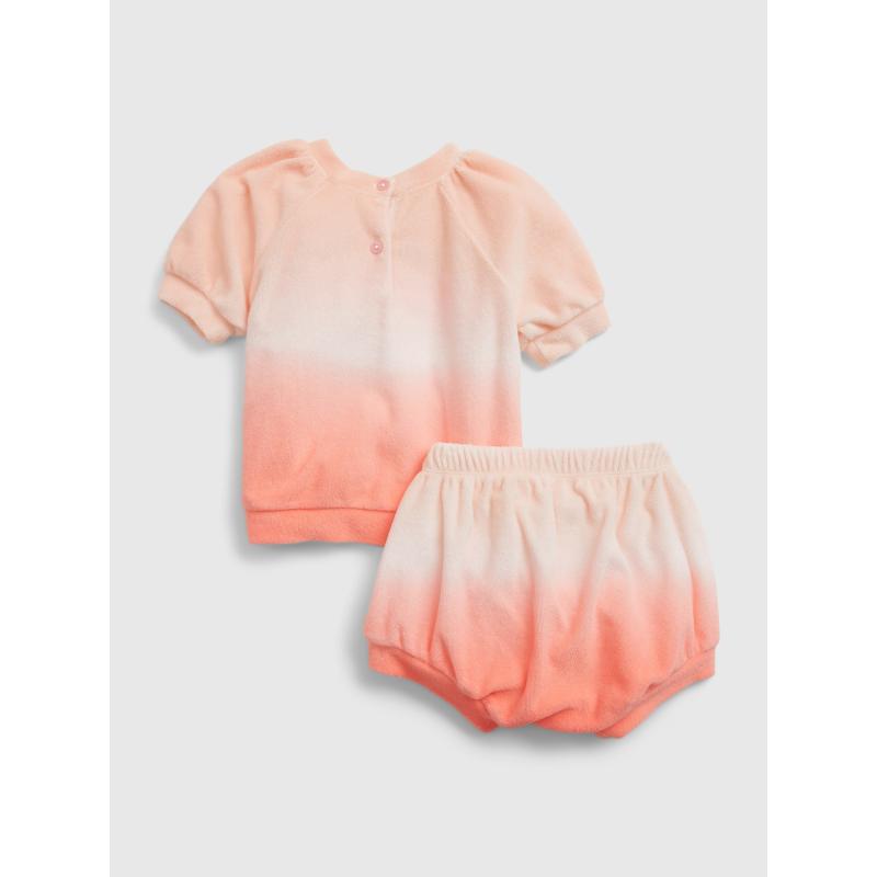 Dívčí set v korálové barvě.Ombré probarvení.Tričko se zapínáním na knoflíčky na zádech.Krátký rukáv s nápletem.Kraťasy s pružným pasem a nohavicemi.Příjemný materiál. 84 % bavlna, 16 % polyester