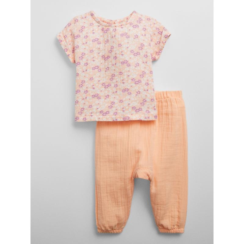 Dětský set tričko a kalhoty.Vzorované tričko s krátkým rukávem.Jednobarevné kalhoty s pružným pasem.Měkký a vzdušný mušelín. 100 % bavlna