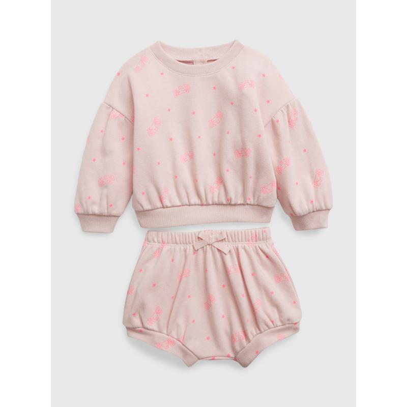 Dětská tepláková souprava.Mikina se zapínáním za krkem.Dlouhé spadlé rukávy s náplety.Kraťasy s pružným pasem.Drobný plošný vzor. 77 % bavlna, 23 % polyester