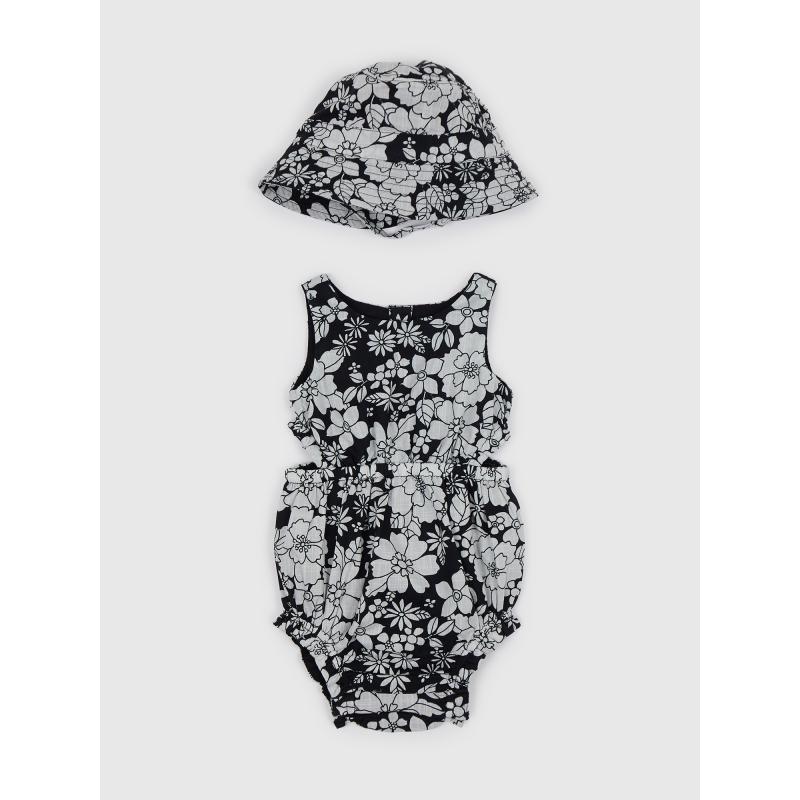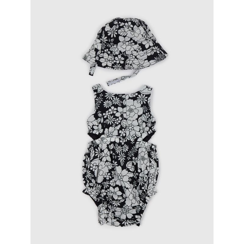 Dětské vzorované body a klobouk.Body bez rukávů a s kulatým výstřihem.Zapínání na druky. 100 % bavlna, podšívka 100 % bavlna