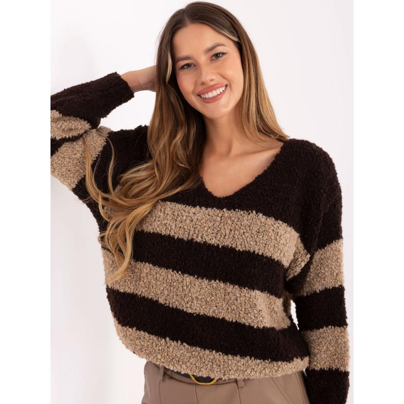 Chcete doručiť tovar na Slovensko? Prezrite si Čokoládovo-kamelový oversized sveter s pruhmi.. Magyarországra történő kiszállításért tekintse meg ezt a termékoldalt: Csokoládé-kamel színű oversized pulóver csíkokkal..