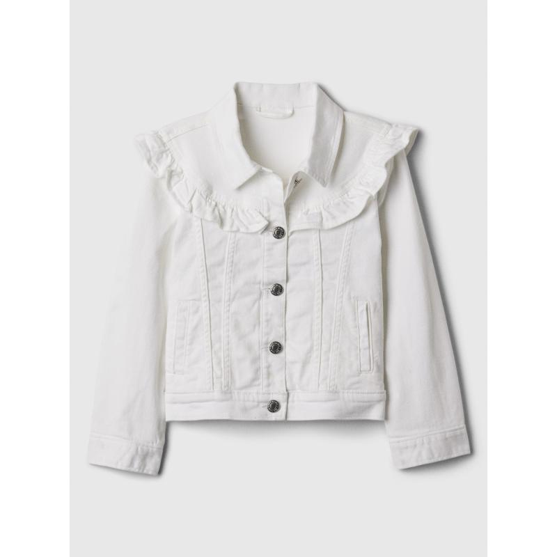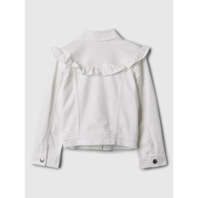 Dětská džínová bunda.Límeček a zapínání na knoflíky.Volánková ozdoba.Dlouhé rukávy s manžetou.Přední našité kapsy.Rovný střih. 98 % bavlna, 2 % elastan