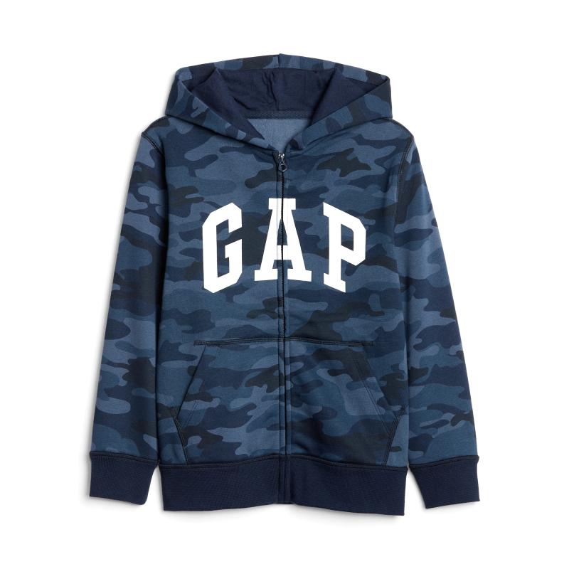 Chlapecká bavlněná mikina maskáčového vzoru s logem Gap.Zapínání na na zip po celé délce a kapucí.Mikina se dvěma kapsami, na rukávech a spodním lemu zakončena pružnou manžetou. 77 % bavlna, 14 % polyester, 9 % recyklovaný polyester