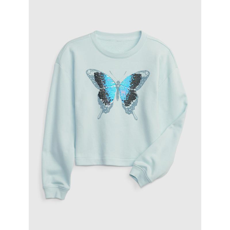 Dětská mikina přes hlavu.Na přední straně motýl z flitrů.Flitry po uhlazení mění barvu.Kulatý výstřih s pružným lemem.Dlouhé spadlé rukávy s náplety.S French Terry. 79 % bavlna, 21 % polyester
