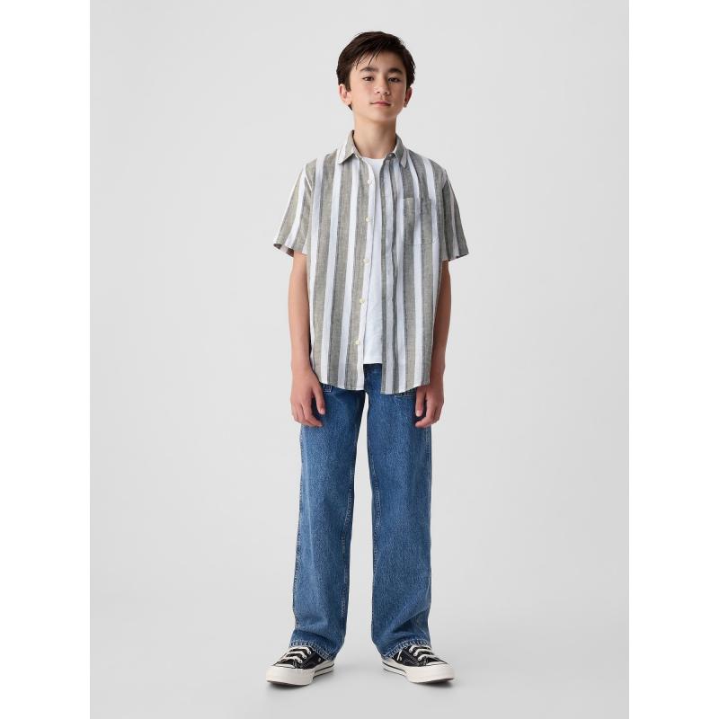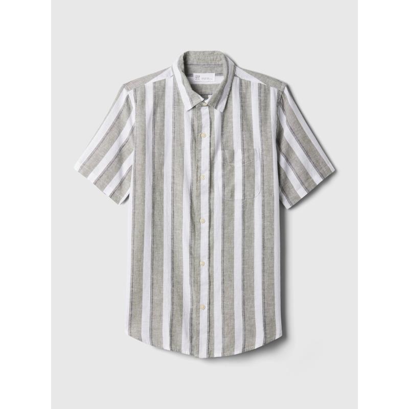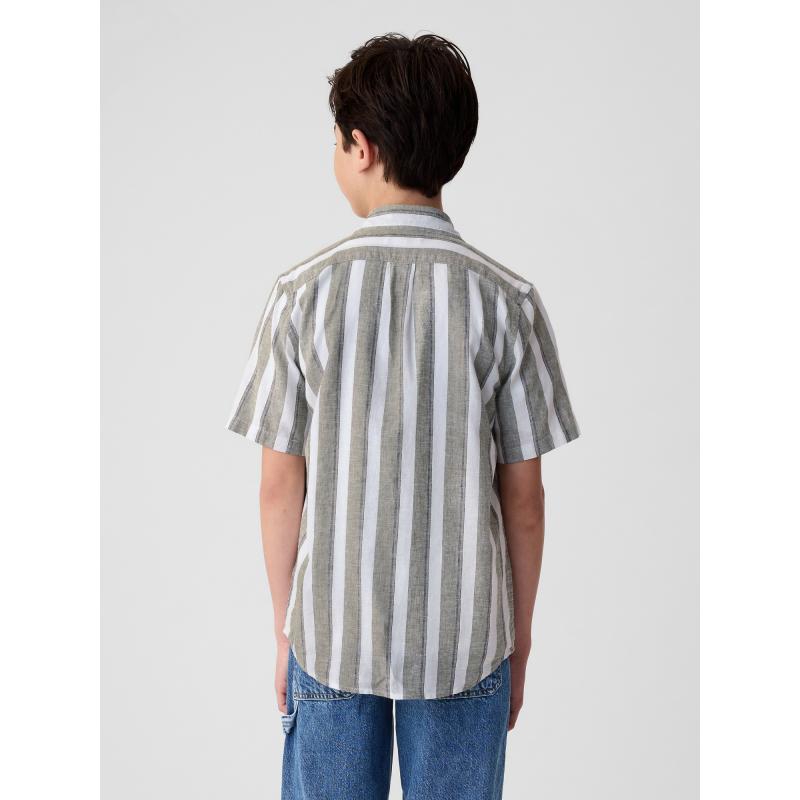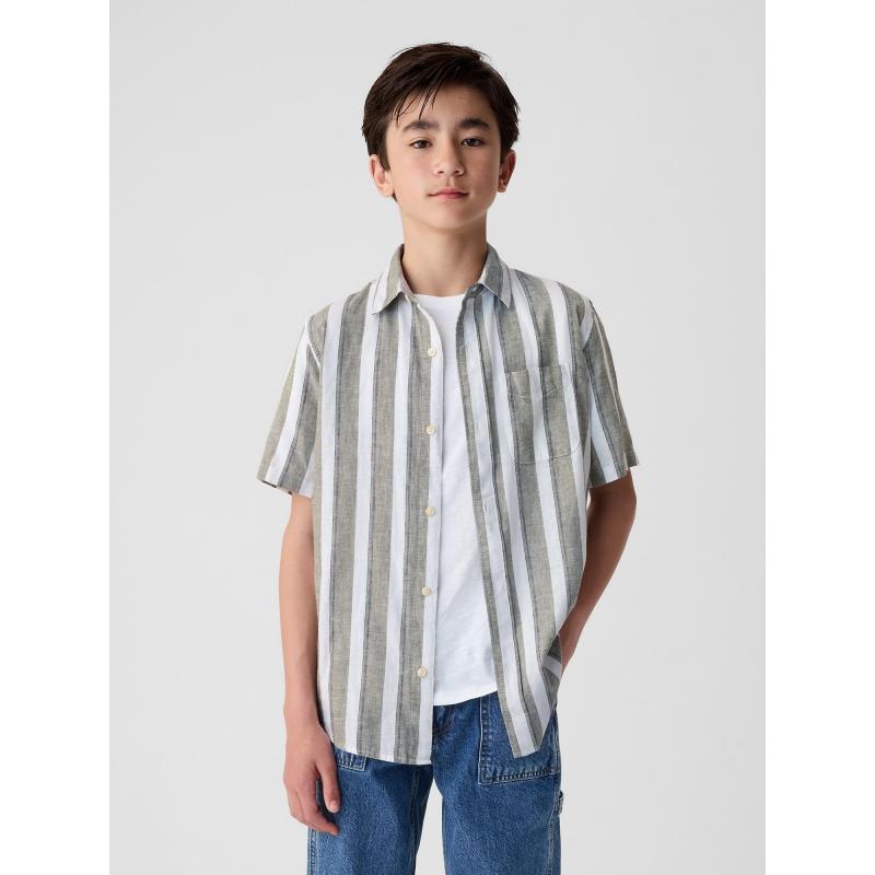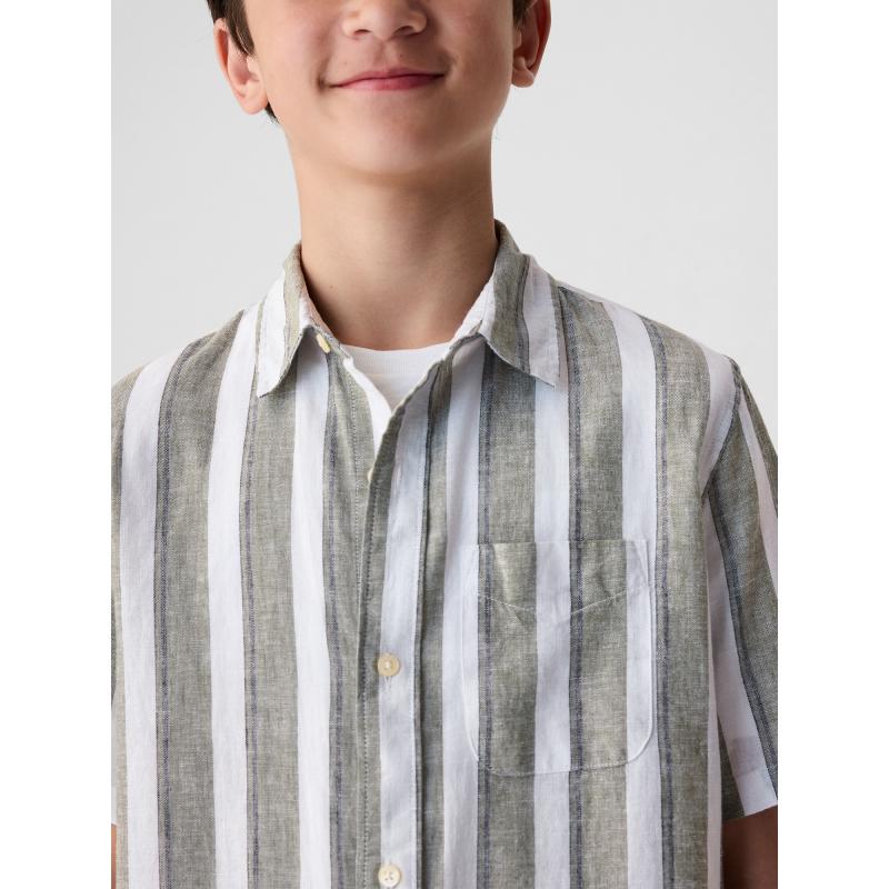 Dětská košile s krátkým rukávem.Materiál len a bavlna.Límeček a zapínání na knoflíčky.Na hrudi našitá kapsa.Barevný pruhovaný vzor.Rovný střih. 55 % len, 45 % bavlna