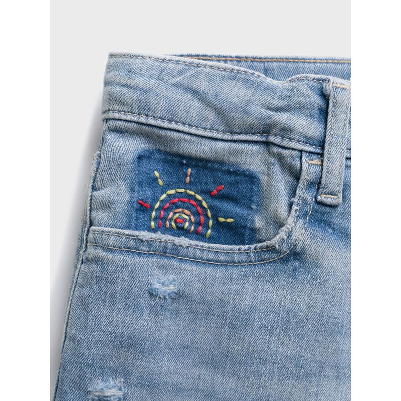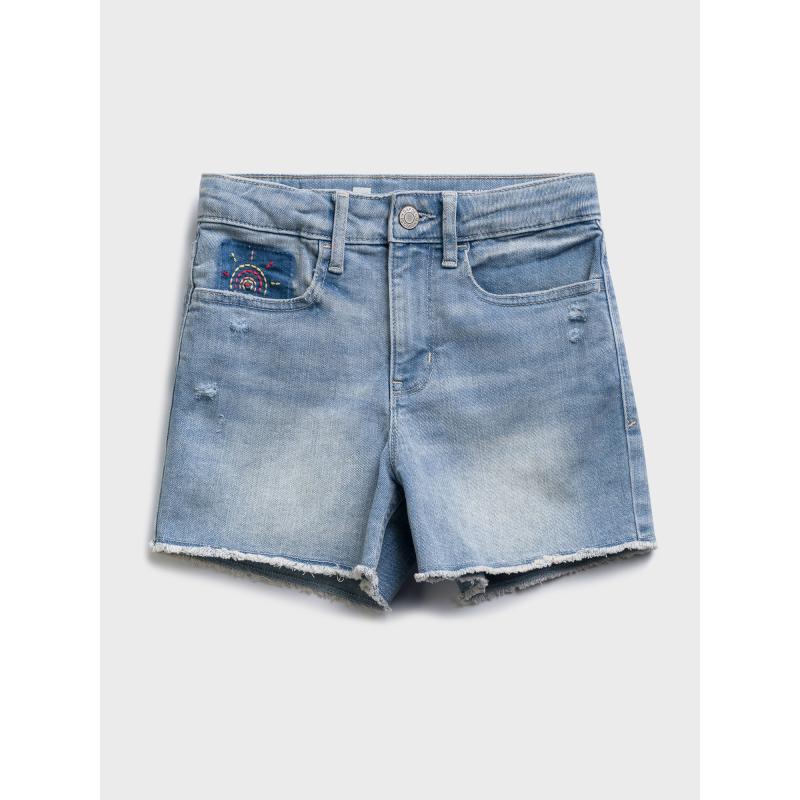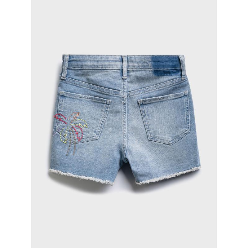 Dívčí džínové kraťasy.Klasické kapsy.Zapínání na zip a knoflík.Lehce obnošený vzhled.S příměsí 12% recyklovaného polyesteru. 62 % bavlna, 27 % polyester, 5 % recyklovaná bavlna, 1 % elastan