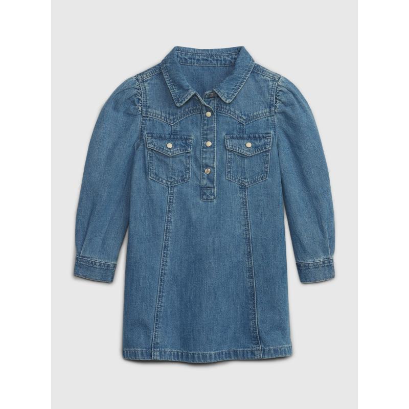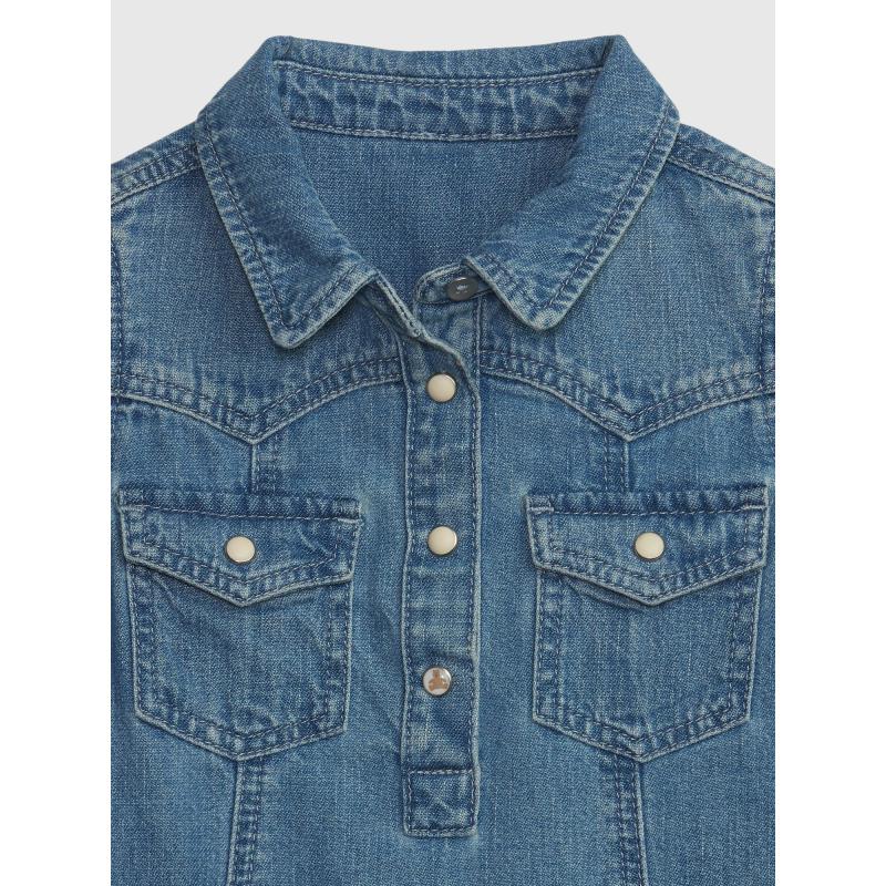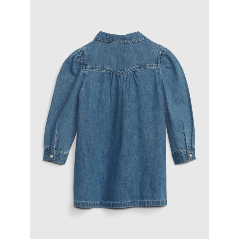 Dětské džínové šaty s dlouhým rukávem.Klasický límeček a zapínání na knoflíky.Na hrudi našité dvě kapsičky.Rukávy s manžetou.Zaoblený spodní lem. 95 % bavlna, 5 % recyklovaná bavlna