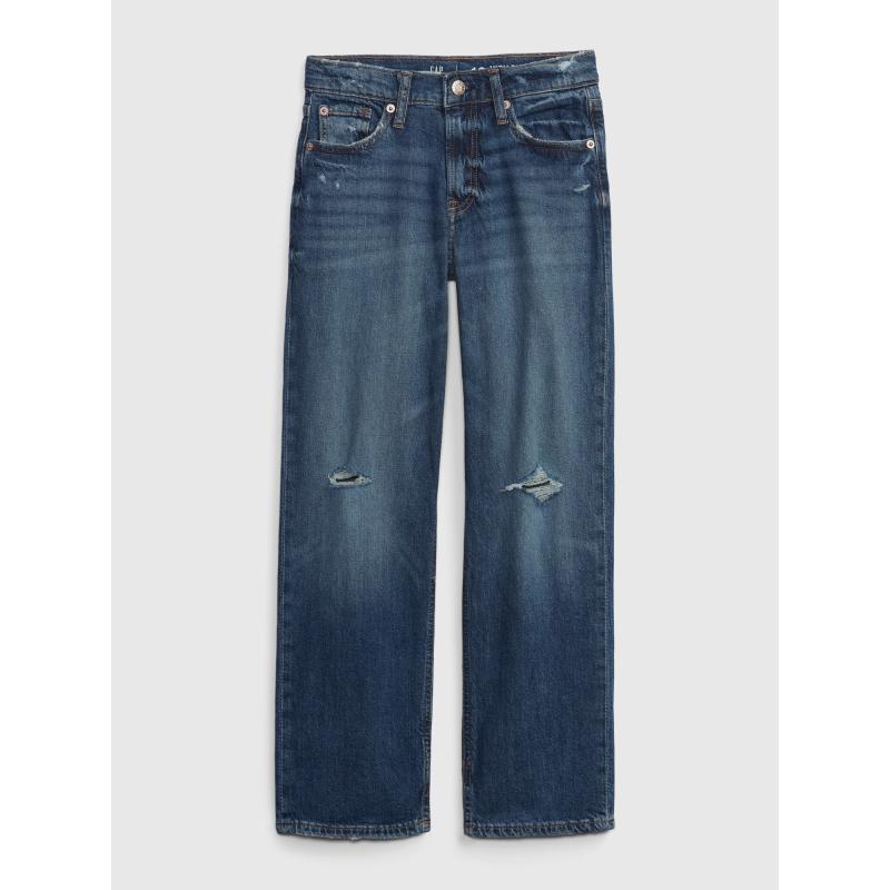 Dětské džíny loose s vysokým pasem.Záměrně obnošený vzhled s děrováním na kolenou.Pevný pas se zapínáním na zip a knoflík.V pase poutka na pásek.Volný střih a široké nohavice. 99 % organická bavlna, 1 % elastan