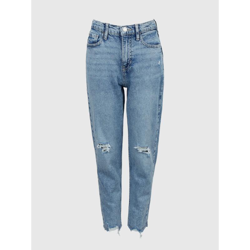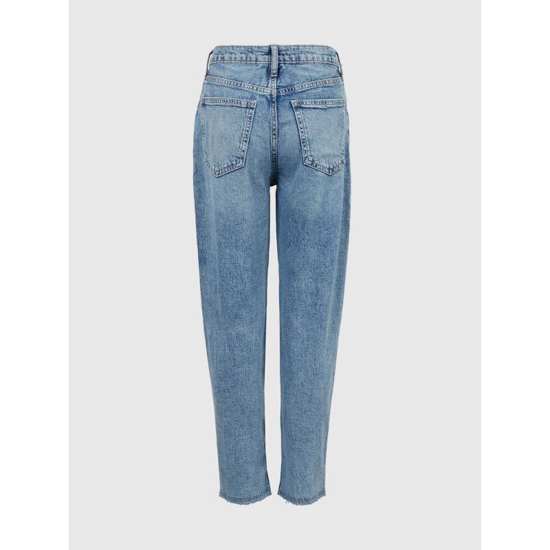 Dívčí džíny ve světle modré barvě.Pohodlný střih mom.Pevný pas se zapínáním na zip a knoflík.V pase poutka na pásek.Klasických 5 kapes.Záměrně obnošený vzhled.5% recyklovaná bavlna. 94 % bavlna, 5 % recyklovaná bavlna, 1 % elastan