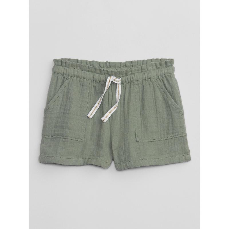 Dětské kraťasy.Pružný pas se stahovací šňůrkou.Přední šikmé kapsy.Měkký mušelín. 100 % bavlna