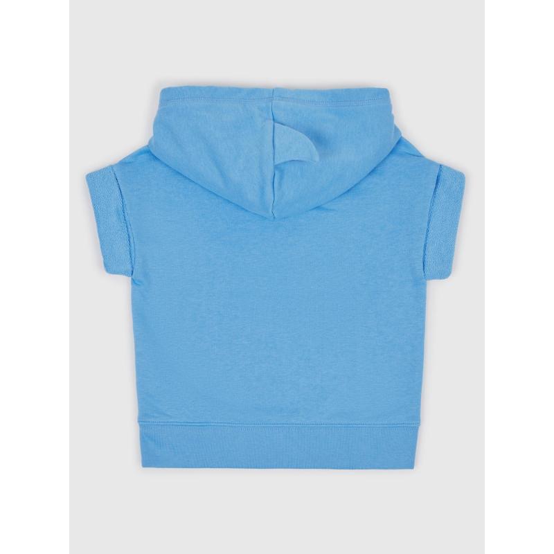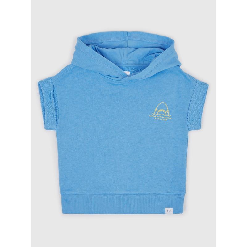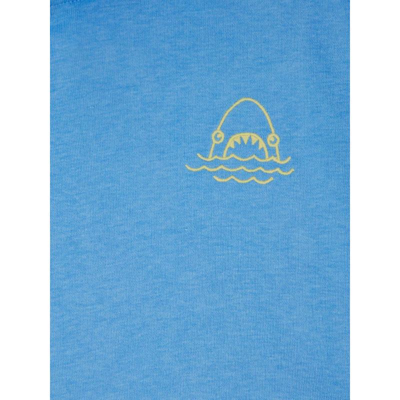 Dětské tričko s kapucí.Drobný potisk žraloka.Spadlé rukávy s náplety.Ve spodní části široký a pružný náplet.11% recyklovaný polyester. 58 % bavlna, 31 % polyester, 11 % recyklovaný polyester