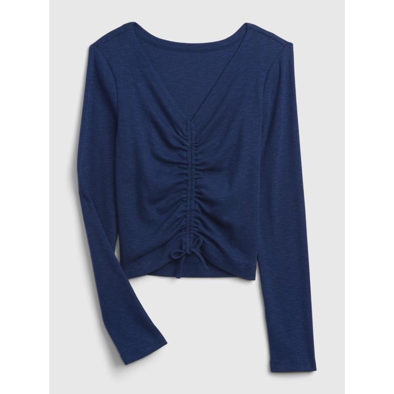 Dětské jednobarevné tričko.Měkký žebrovaný úplet.Výstřih do V.Dlouhé rukávy.Vpředu nabíraný detail. 52 % bavlna, 29 % polyester, 15 % viskóza, 4 % elastan