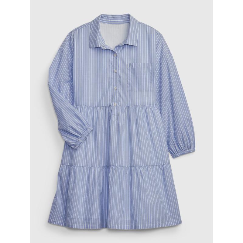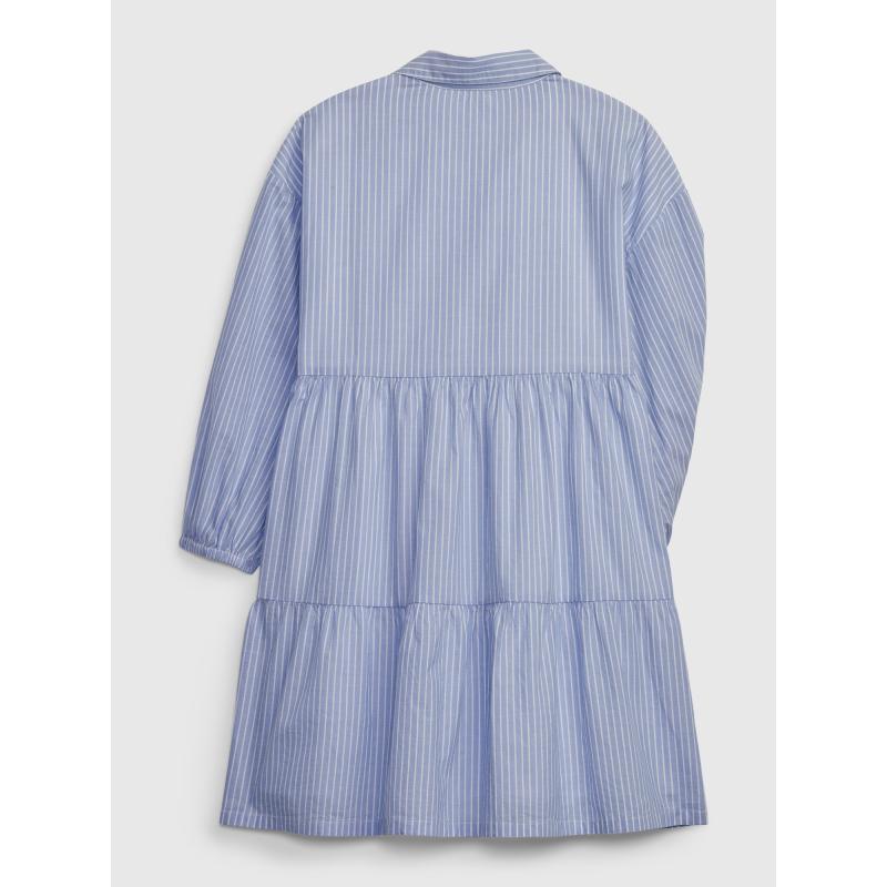 Dětské bavlněné šaty.Střih přes hlavu.Límeček a našitá malá kapsička.V horní části zapínání na knoflíky.Pruhovaný vzor.Dlouhé rukávy.Dva řasené volány. 100 % bavlna