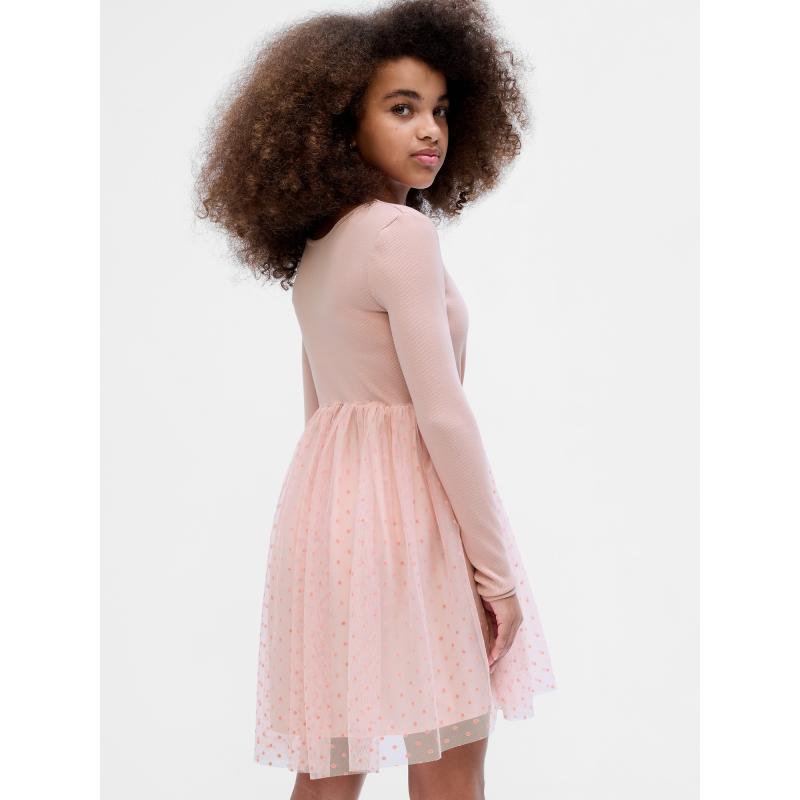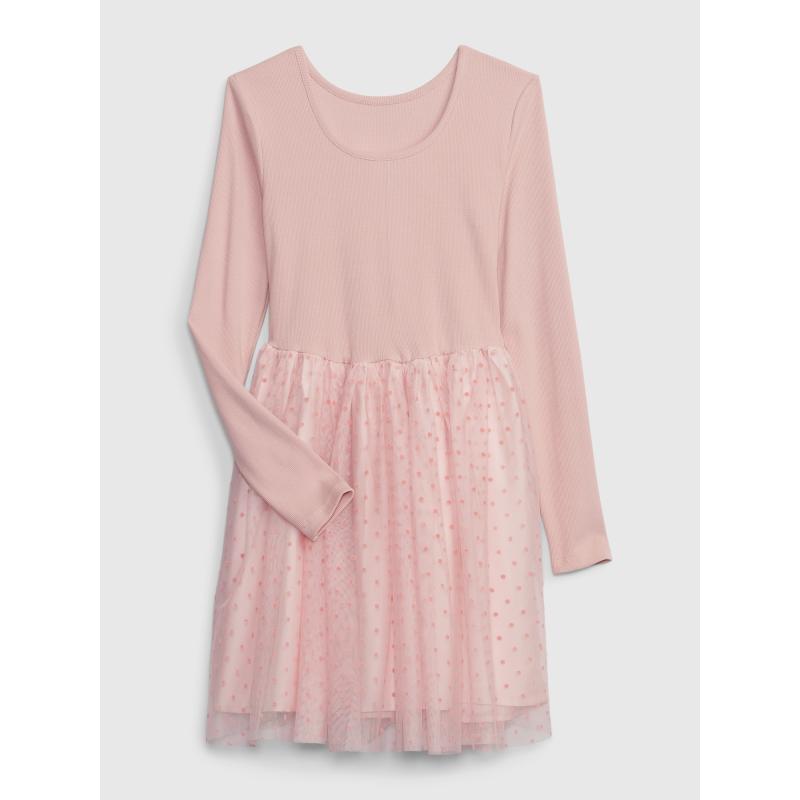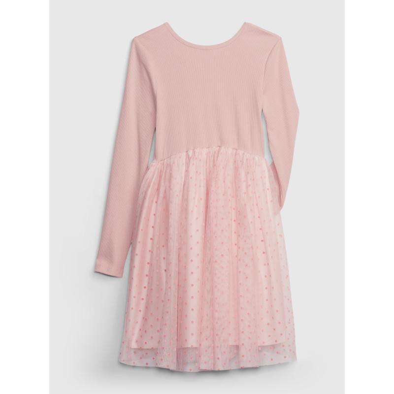 Dívčí jednobarevné šaty.Měkký žebrovaný úplet.Kulatý výstřih a dlouhé rukávy.Sukně z průsvitného tylu.Puntíkovaný vzor. 97 % bavlna, 3 % elastan