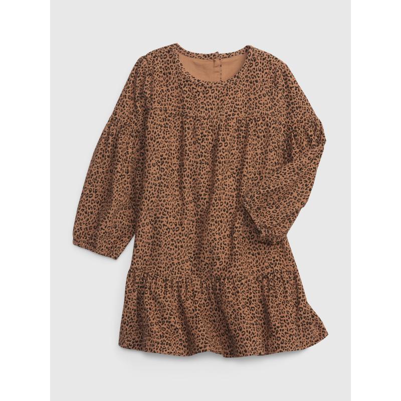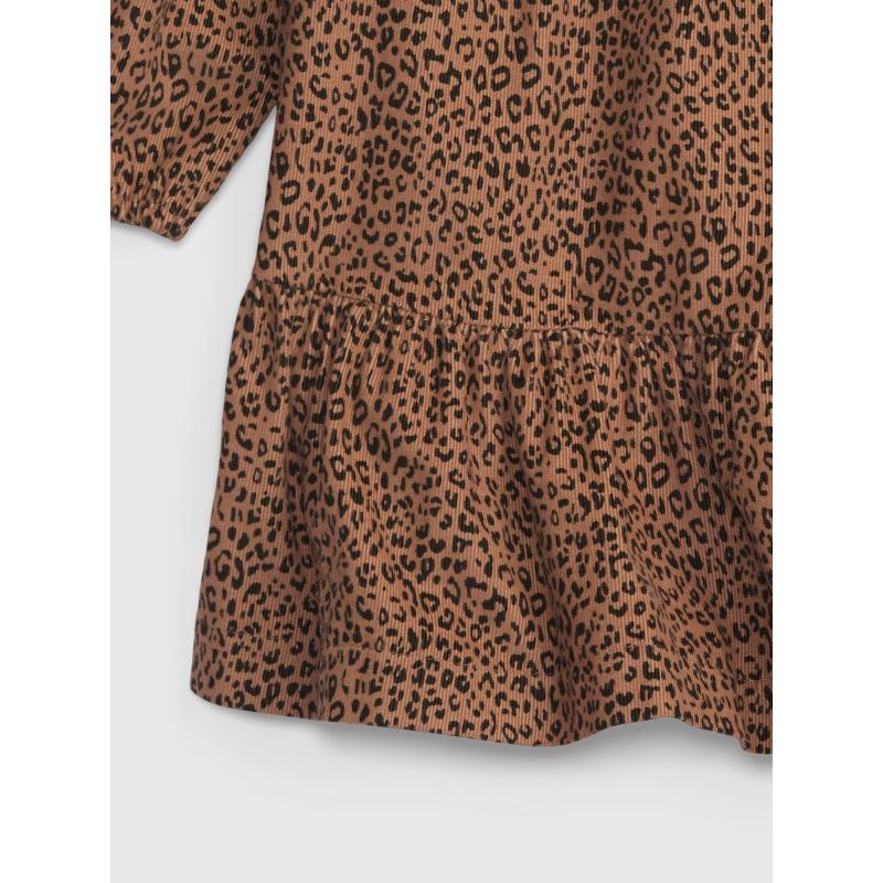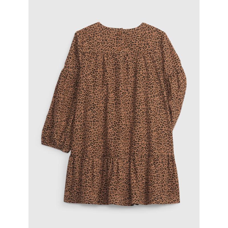 Dětské tkané šaty. Moderní leopardí vzor. Dlouhé spadlé rukávy. Volný áčkový střih. Kulatý výstřih se zapínáním vzadu na knoflík. Bohatě nabíraný volán. 100% bavlna. 100 % bavlna