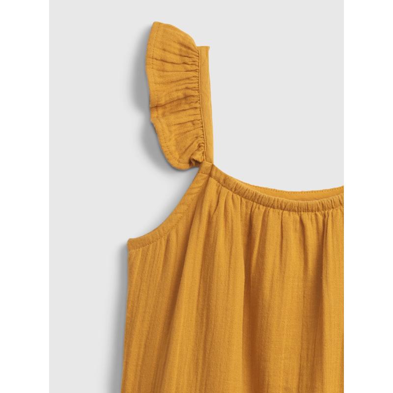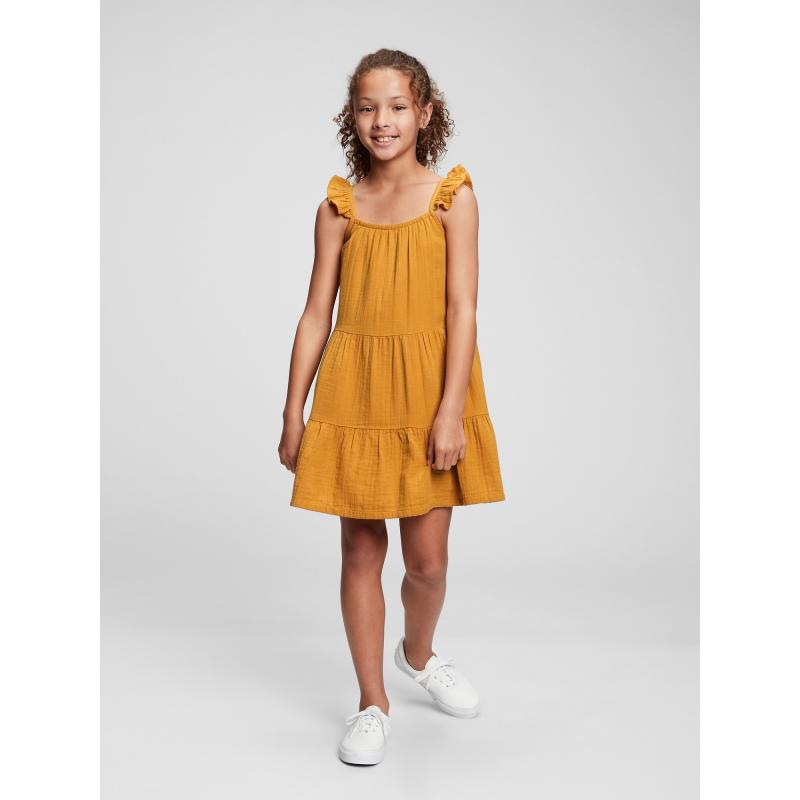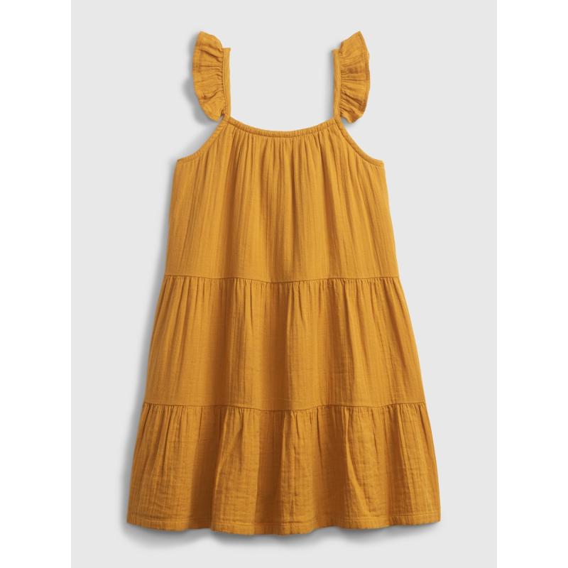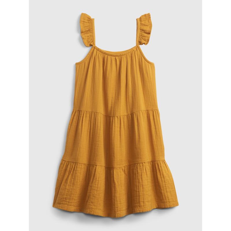 Dětské letní šaty.S úzkými ramínky s volánky.Šaty jsou bavlněné a volánkové.Hořčicová barva.100% bavlna. 100 % bavlna