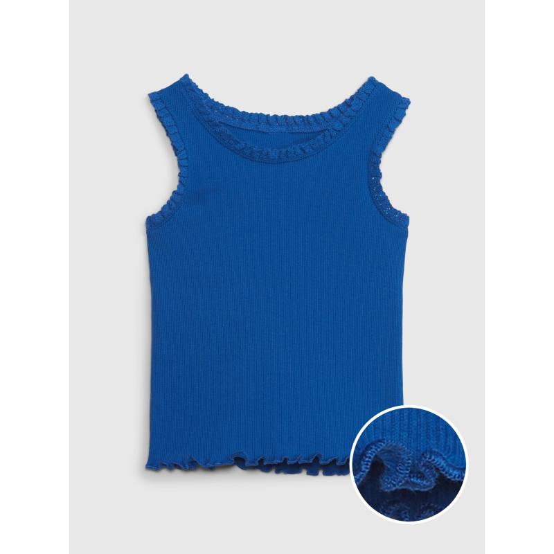 Dětské tílko s krajkovým lemem.Kulatý výstřih.Jemný žebrovaný vzor.Široká ramínka.Měkký úplet.Spodní díl ozdobně olemován. 100 % bavlna