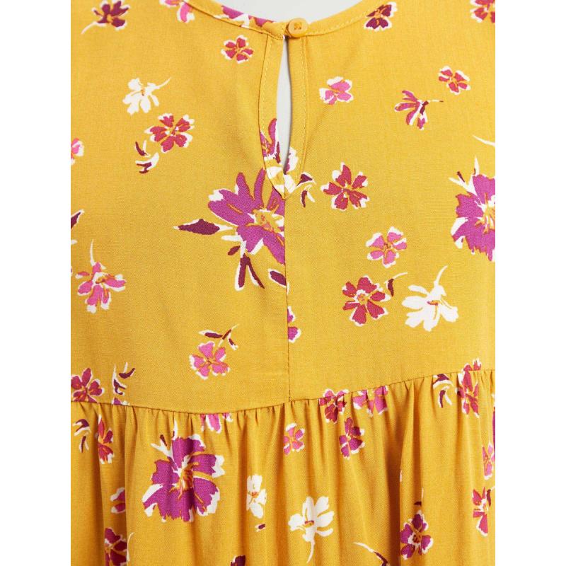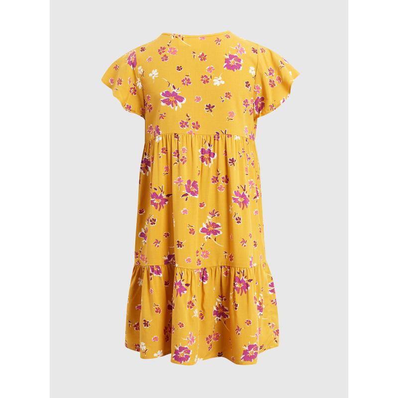 Dětské šaty s květinovým vzorem.Kulatý výstřih se zapínáním na jeden knoflíček.Sešité bohatě řasené volány.Krátké rukávy. 100 % viskóza