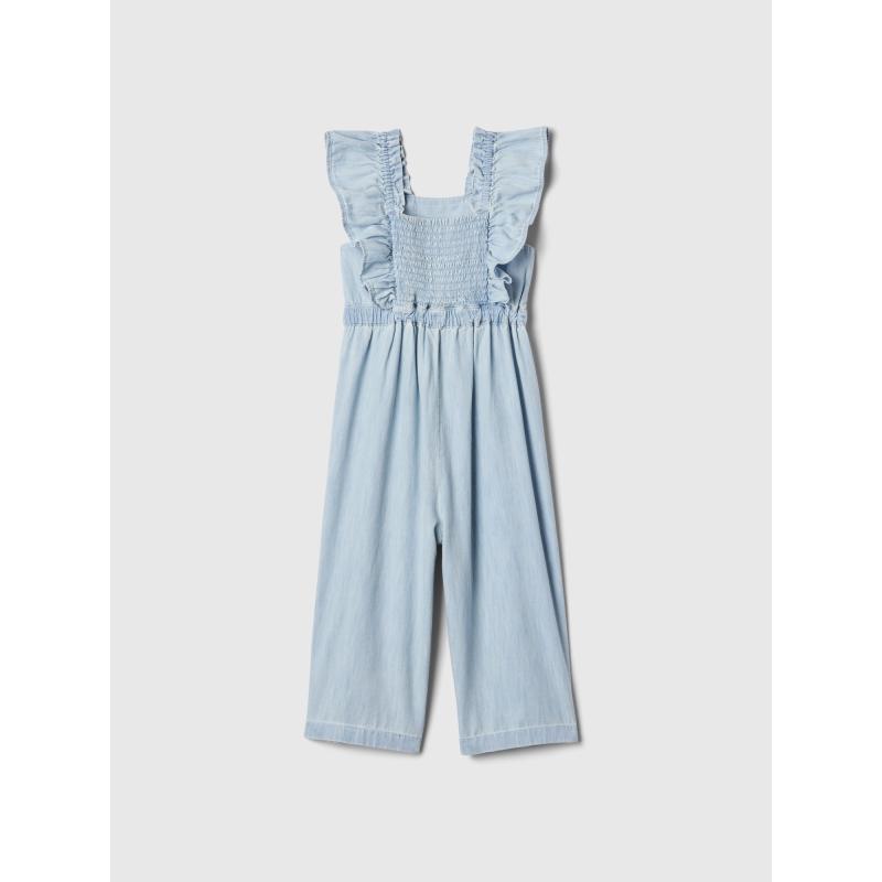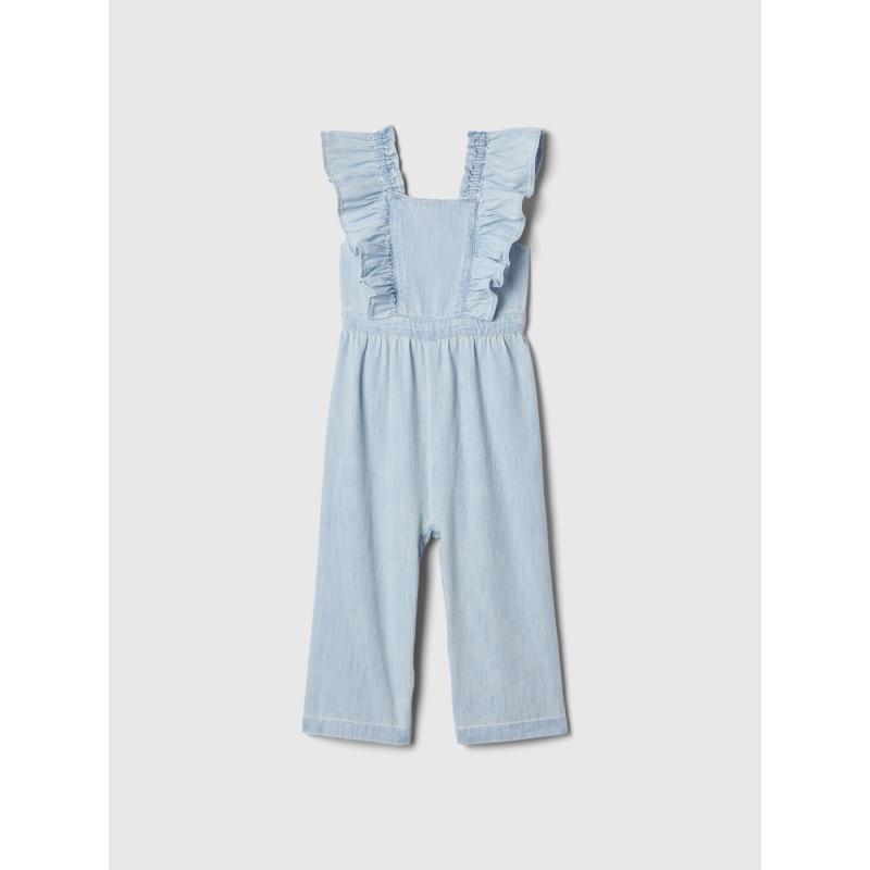 Dětský džínový overal.Čtvercový výstřih.Krátké volánkové rukávy.Pružná záda a pas.Volné nohavice. 100 % bavlna