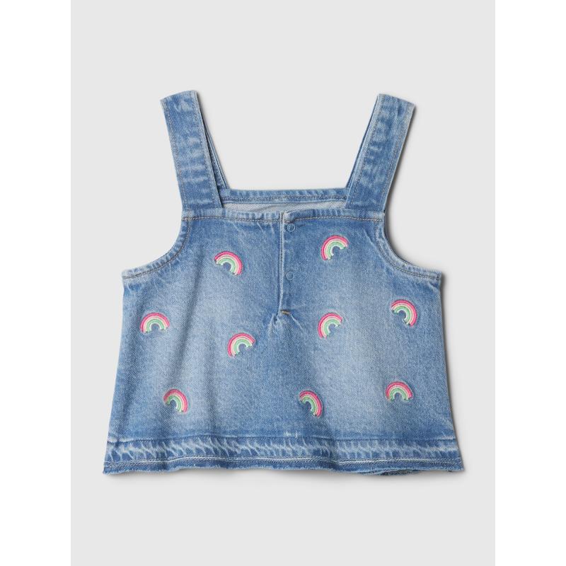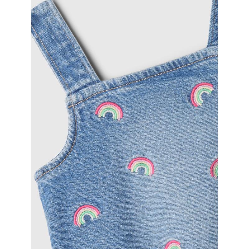 Dětský džínový top.Čtvercový výstřih.Široká ramínka a rovný střih.Plošný vzor duhová výšivka. 94 % bavlna, 5 % recyklovaná bavlna, 1 % elastan