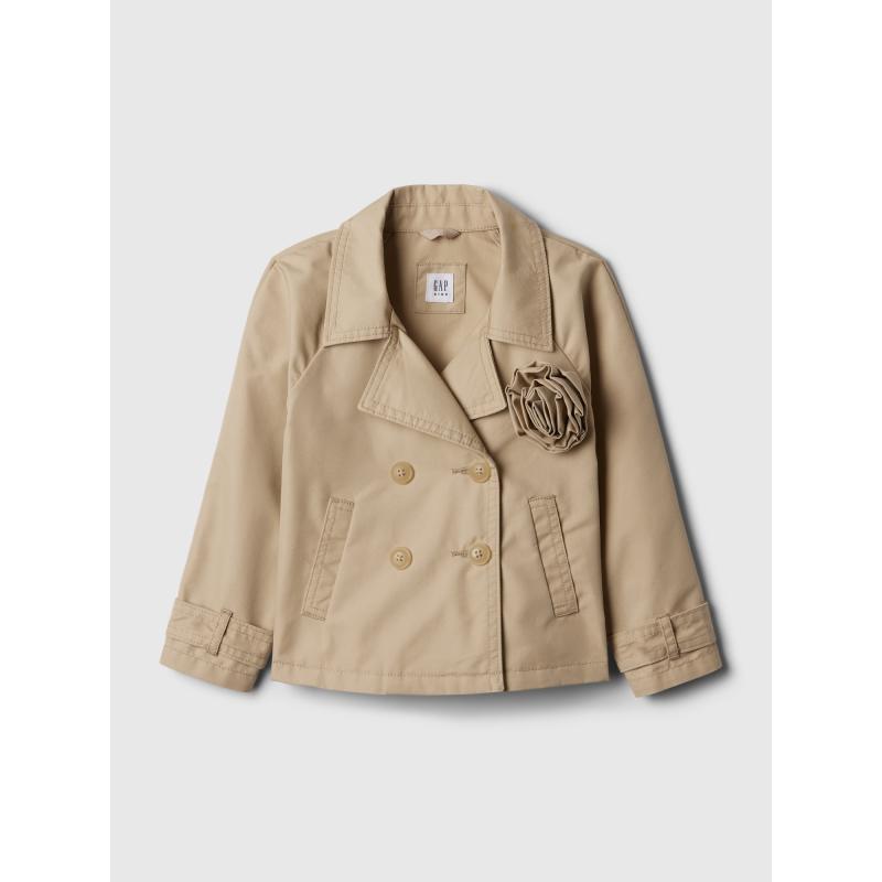 Dětský kabát trenčkot.Dvouřadé zapínání.Dlouhé rukávy.Klopy a přední šikmé kapsy.Květinová ozdoba.Kratší délka. 65 % bavlna, 35 % polyester