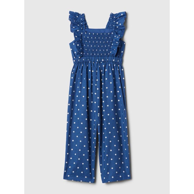 Dětský lněný overal.Materiál len a bavlna.Puntíkovaný vzor.Čtvercový výstřih.Ramínka s volánky.Pružný pas a zadní díl.Dlouhé nohavice. 55 % len, 45 % bavlna