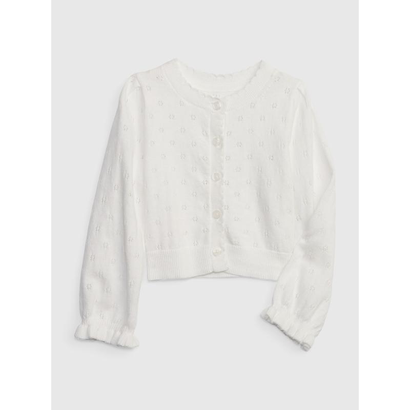 Dětský pletený kardigan.Se zapínáním na knoflíčky.Dlouhé rukávy s volánkem.Měkká bavlněná pletenina.Krajkový vzor. 100 % bavlna