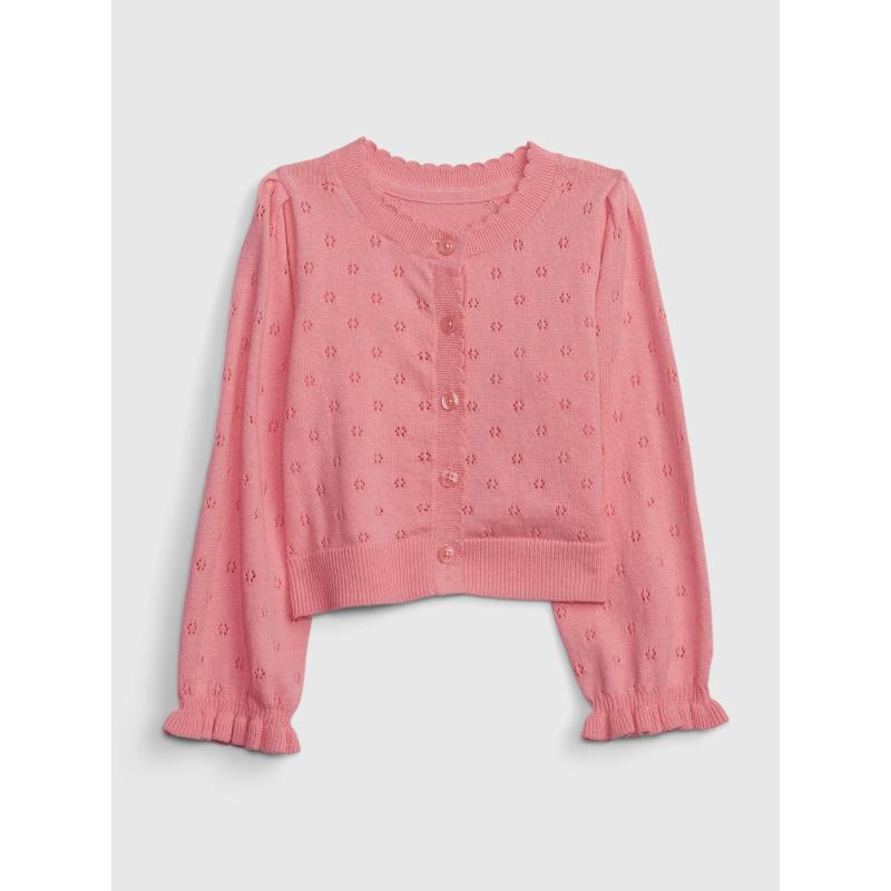 Dětský pletený kardigan.Se zapínáním na knoflíčky.Dlouhé rukávy s volánkem.Měkká bavlněná pletenina.Krajkový vzor. 100 % bavlna