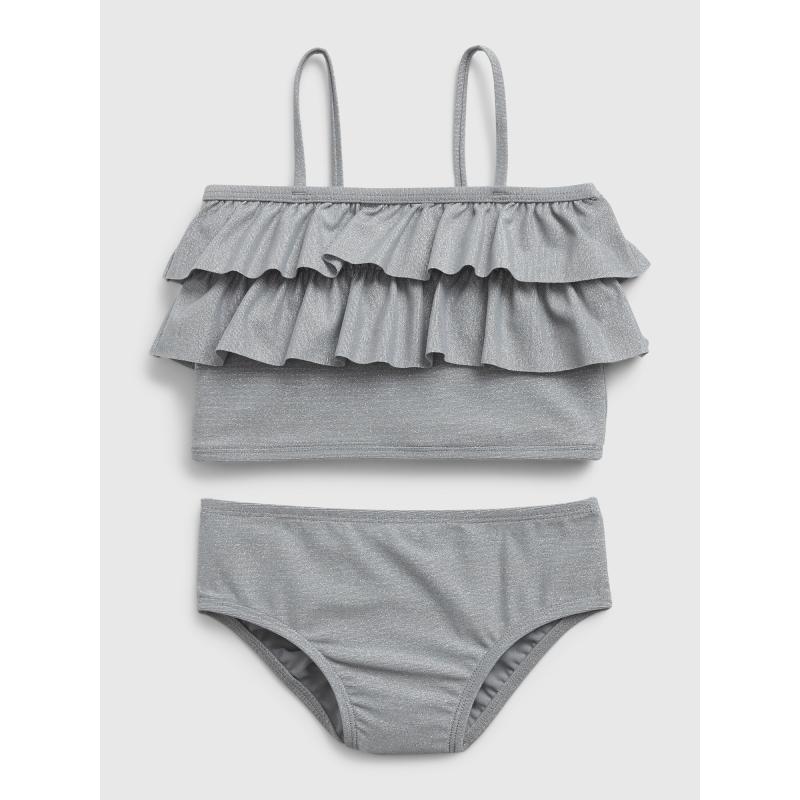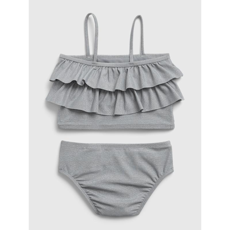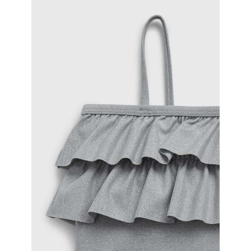 Dívčí dvoudílné plavky.Měkký strečový úplet.S metalickým leskem.Horní díl s volánky.Špagetová ramínka.Klasické plavkové kalhotky.UV ochrana UPF 50+. 66 % polyester, 12 % nylon, 11 % elastan, 11 % metalické vlákno