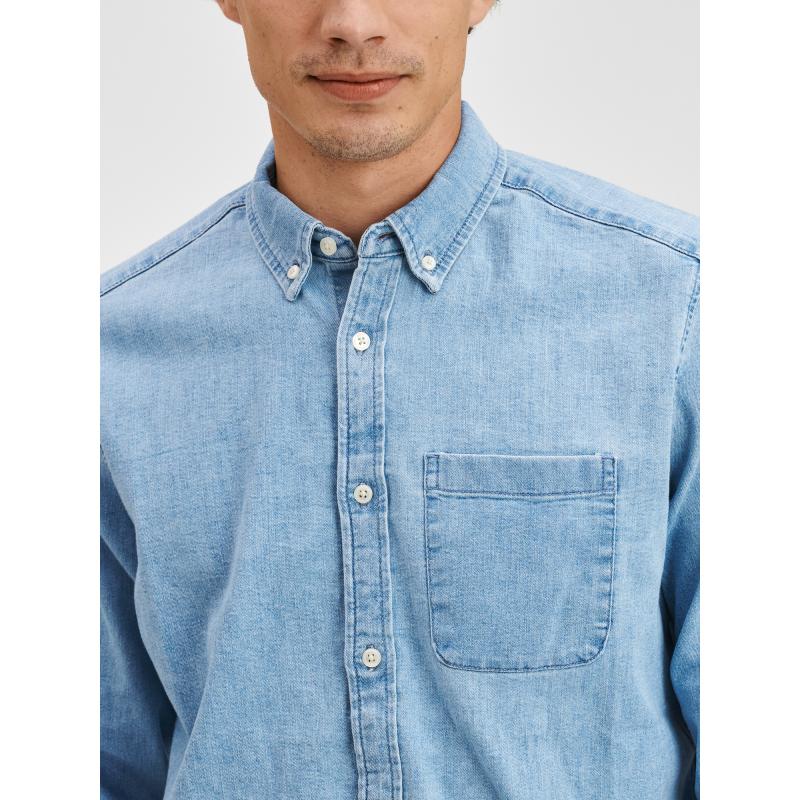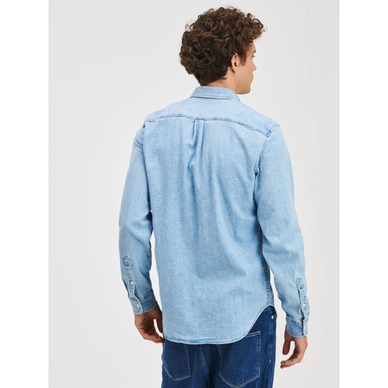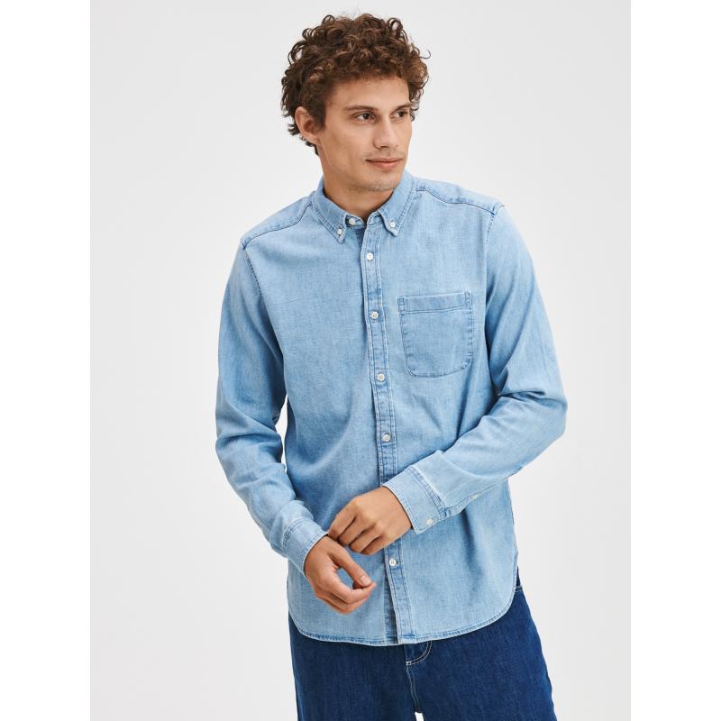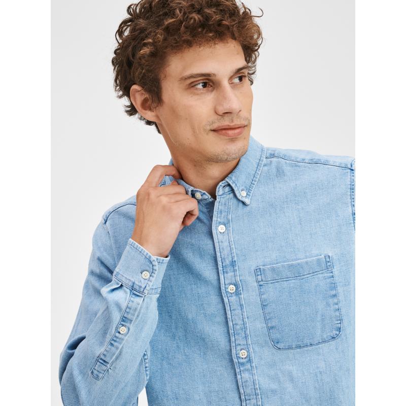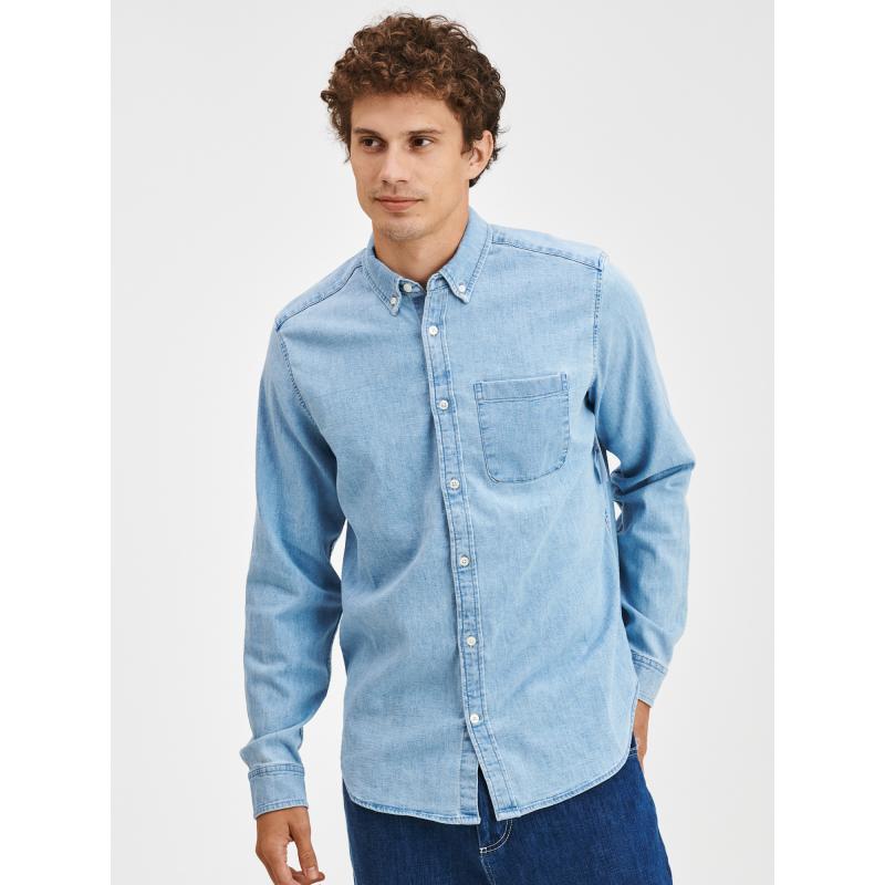 Pánská džínová košileKrátký límeček se zapínáním na knoflíčekMalá kapsička na hrudiDlouhé rukávy s manžetouPříjemný materiál s elastanem. 84 % bavlna, 15 % polyester, 1 % elastan