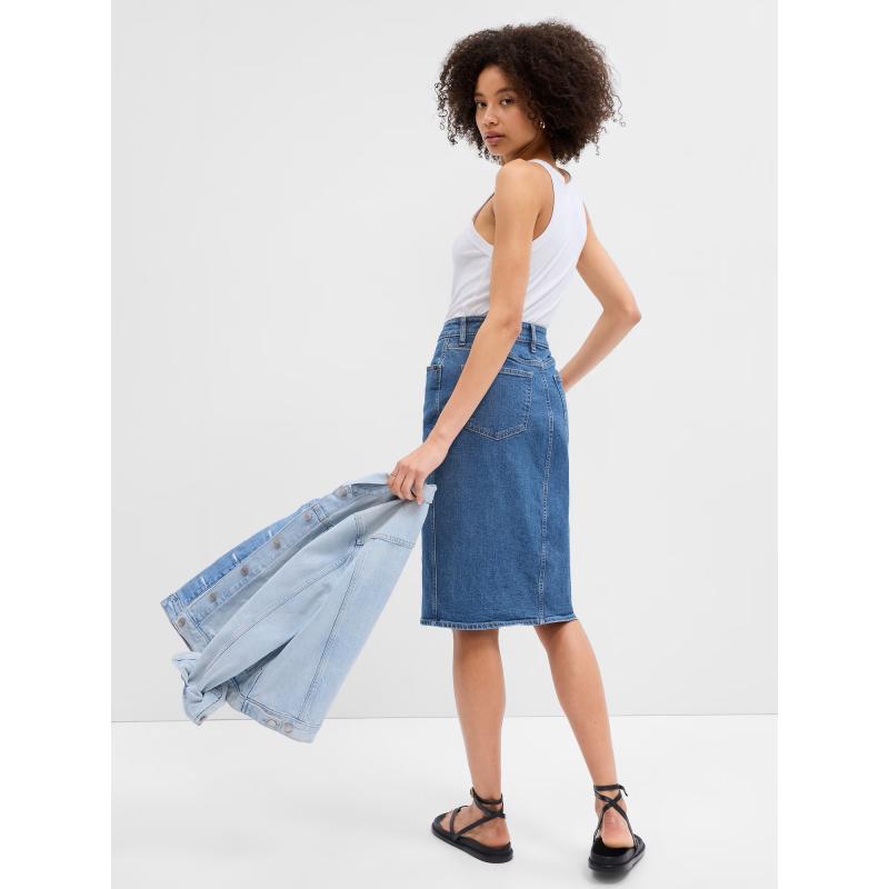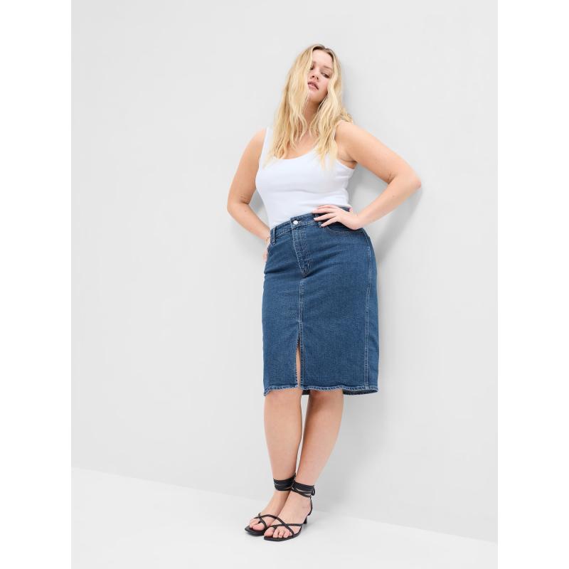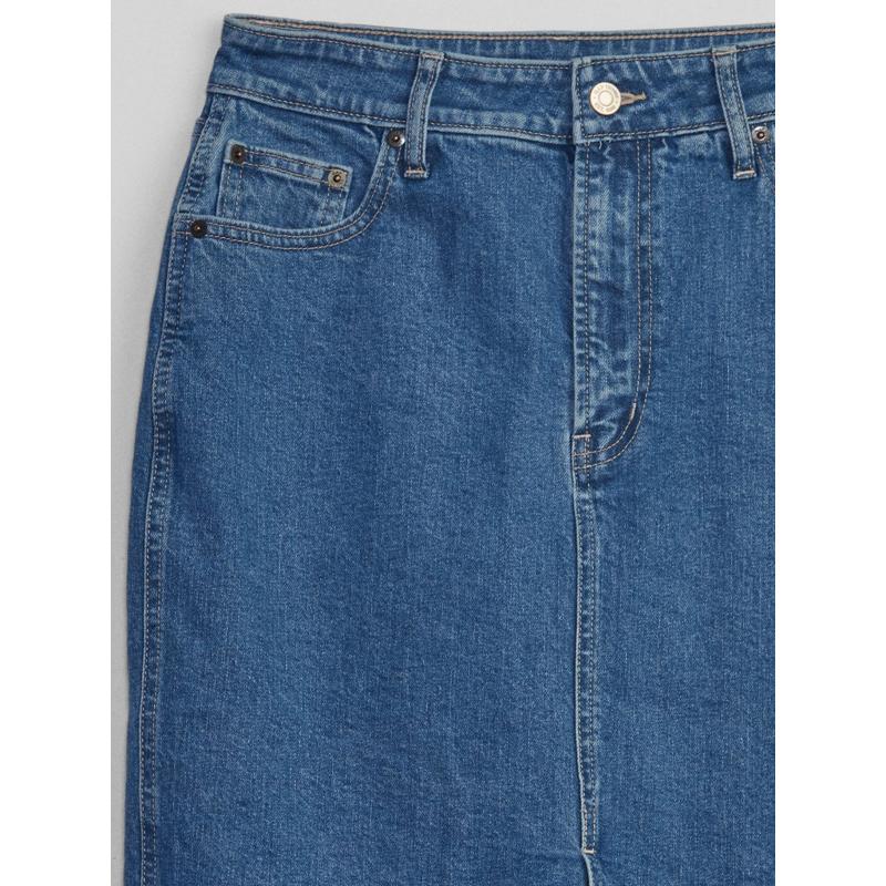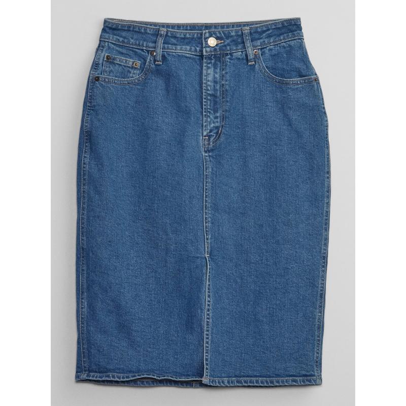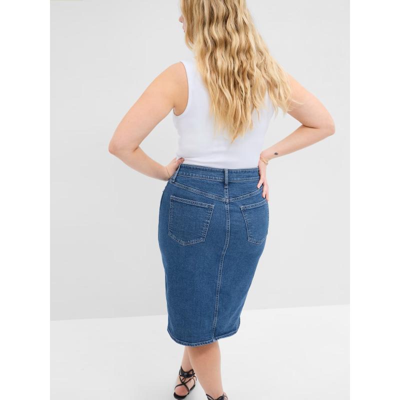 Džínová midi sukně.Pevný pas s poutky na pásek.Styl s 5 kapsami.Se zapínáním na knoflík a zip.Rozparek. 93 % bavlna, 5 % recyklovaná bavlna, 2 % elastan