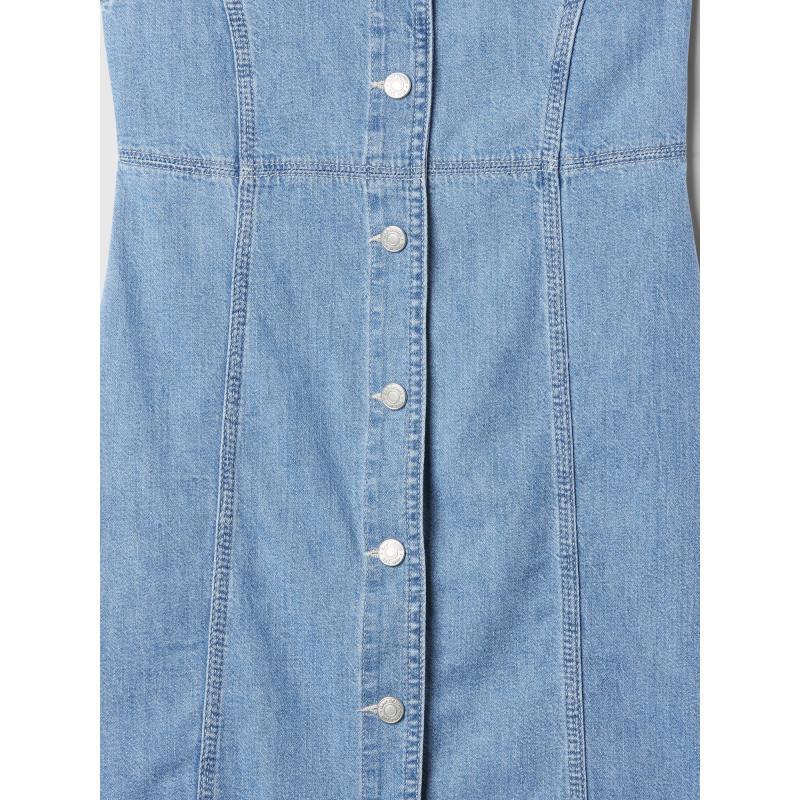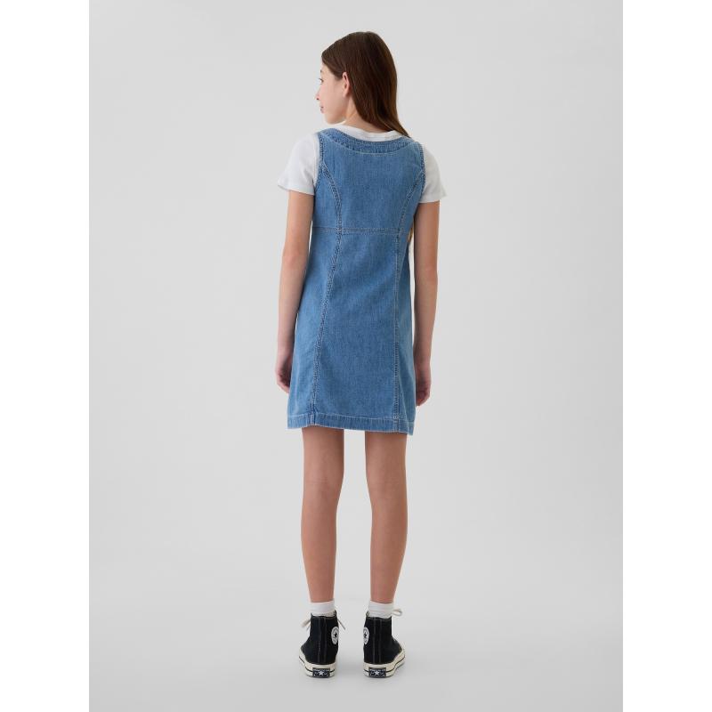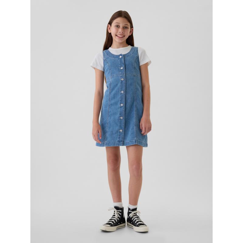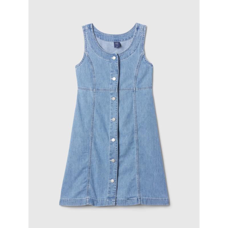 Dětské džínové šaty. Měkký materiál. Kulatý výstřih, bez rukávů. Zapínání na knoflíky vpředu. Rovný střih. Délka ke kolenům. 100 % bavlna