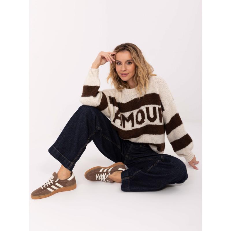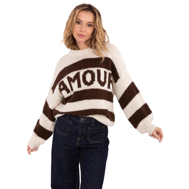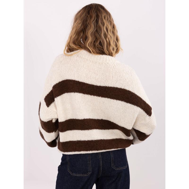 Ecru-hnedý dámsky oversized sveter s pruhmi