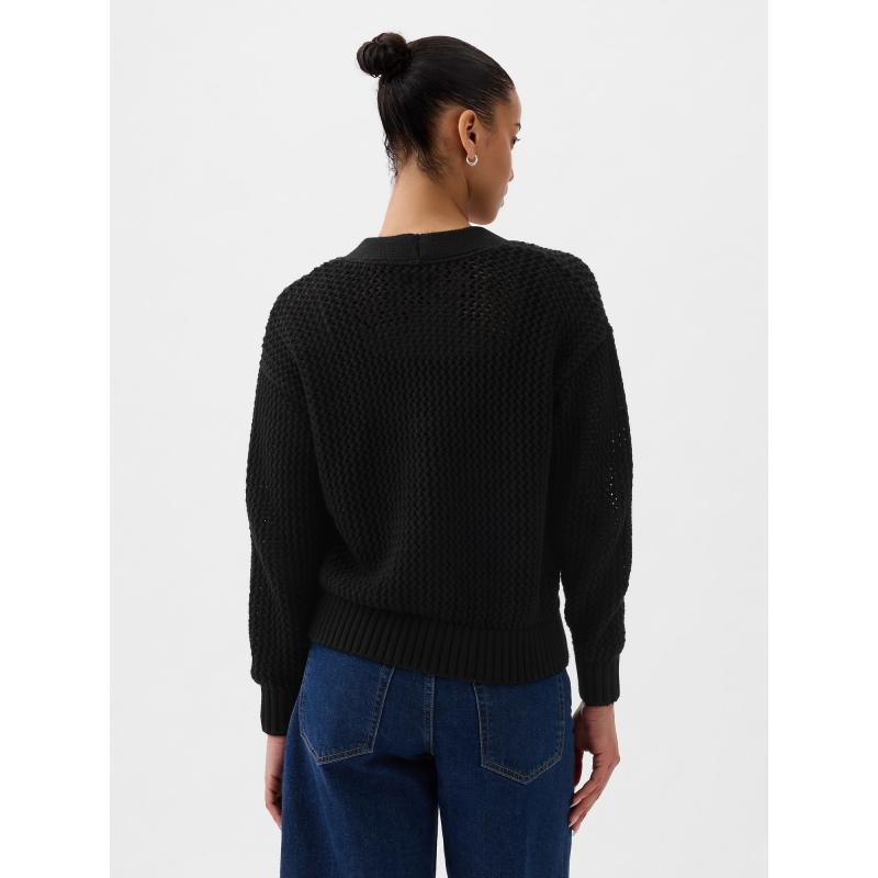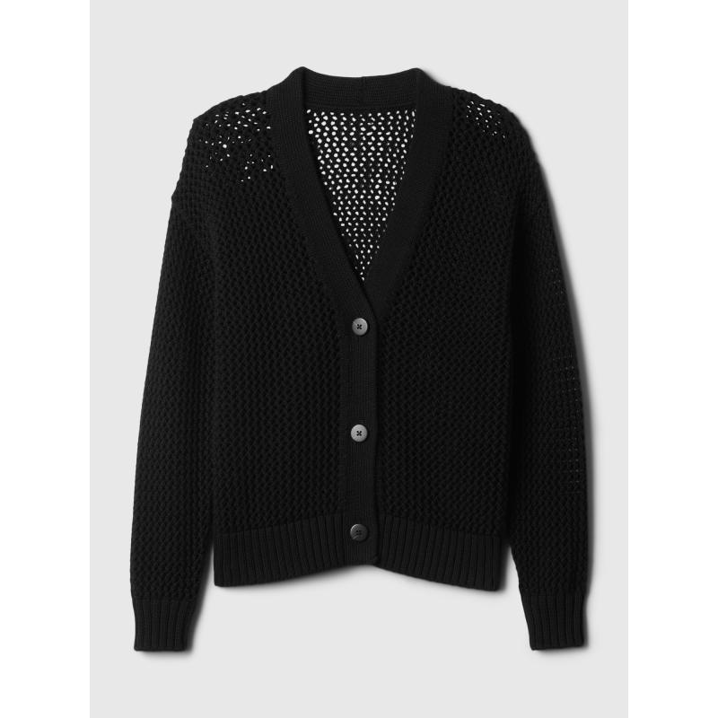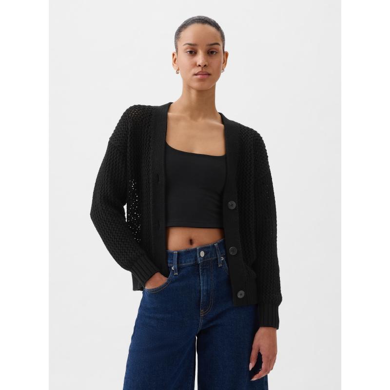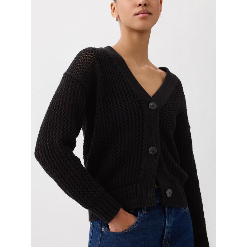 Dámský háčkovaný kardigan.Se zapínáním na knoflíky.Výstřih do V.Dlouhé spadlé rukávy.Pružné žebrované náplety. 100 % bavlna