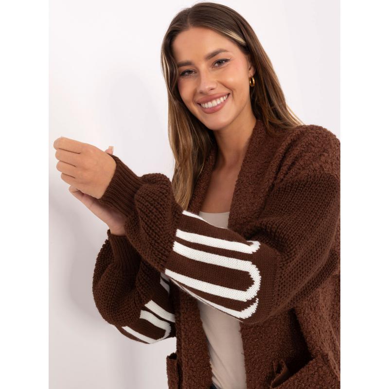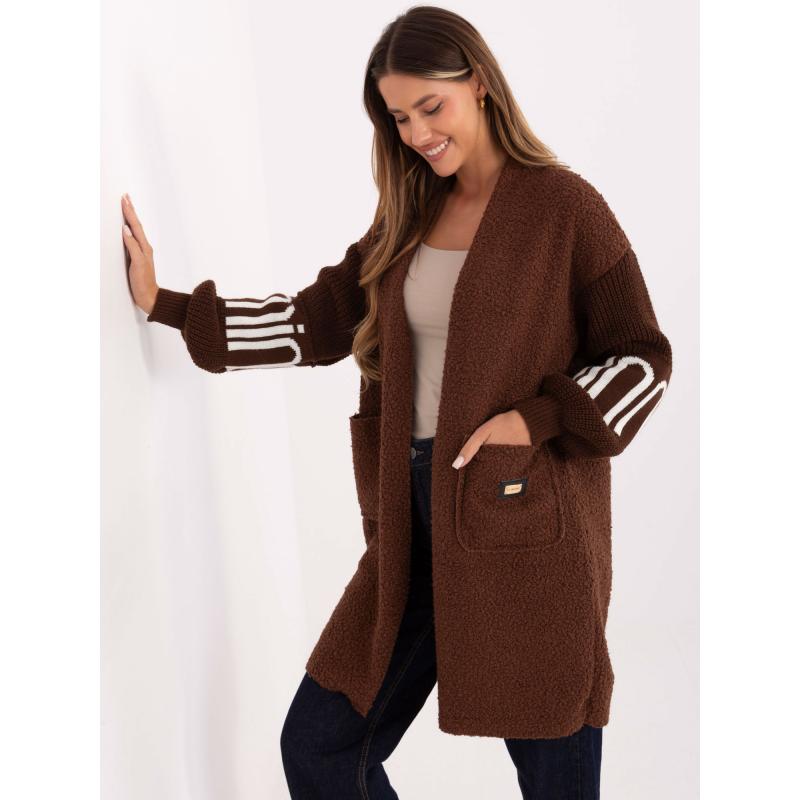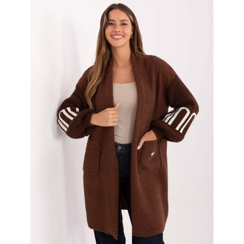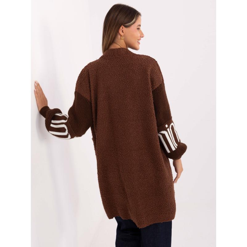 Hnědý dlouhý kardigan s kontrastními rukávy.