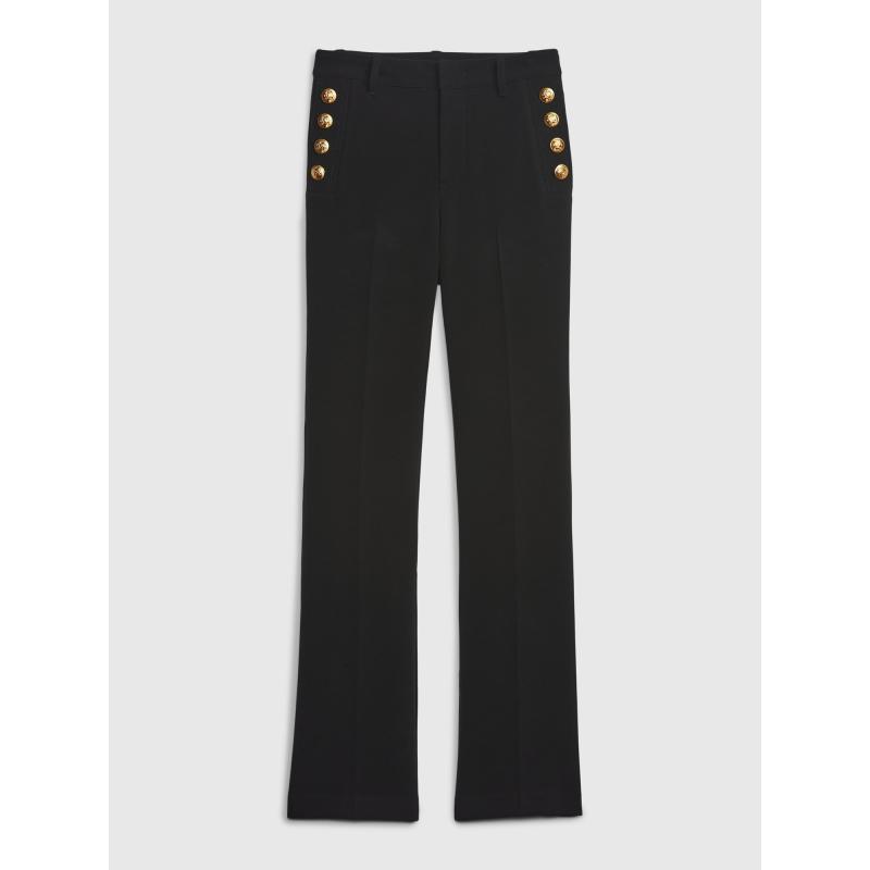 Dámské kalhoty z měkkého strečového materiálu kombinují formální vzhled s pohodlným střihem.Středně vysoký pas (25 cm) jemně tvaruje siluetu a úzký střih přes boky a stehna plynule přechází do lehce rozšířené nohavice typu mini bootcut.Skrytý háček a zip udržují hladkou linii pasu, zatímco zlaté dekorativní knoflíky na bocích v námořnickém stylu dodávají stylový prvek.Zadní kapsy doplňují elegantní vzhled, který se hodí jak do kanceláře, tak na večerní příležitosti.Celková délka kalhot a šířka dolního lemu 44 cm podtrhují vyváženou siluetu.Modelky ve velikosti 27 měří 172–180 cm, mají pas 60–66 cm a boky 84–97 cm.Modelky ve velikosti 33 mají pas 86–91 cm a boky 114–127 cm. 63 % polyester, 33 % viskóza, 4 % elastan