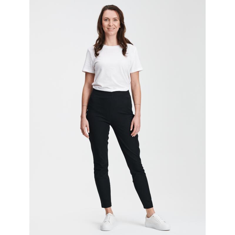 Dámské kalhoty z jemného strečového materiálu kombinují čistý vzhled s komfortem.Vysoký pas lichotí postavě a přiléhavý střih krásně obepíná boky i stehna.Elastický pas zajišťuje pohodlné padnutí bez zbytečného objemu a skrytý boční zip zachovává elegantní siluetu.Díky pružné tkanině se kalhoty přizpůsobí pohybu a drží tvar.Ideální volba pro dny, kdy potřebujete vypadat upraveně a zároveň se cítit pohodlně – do práce, na schůzky i volný čas.Modelka Tsheca měří 175 cm, má pas 60 cm, boky 86 cm a nosí velikost 27. 95 % bavlna, 5 % elastan