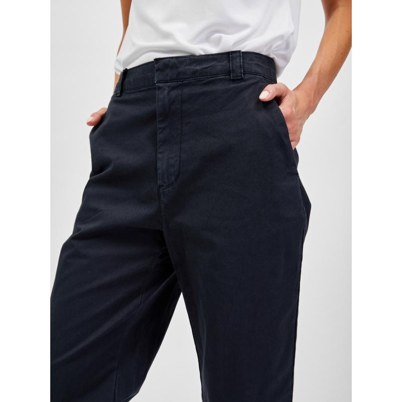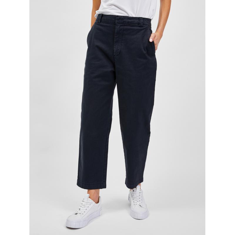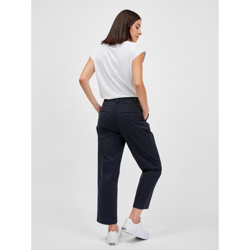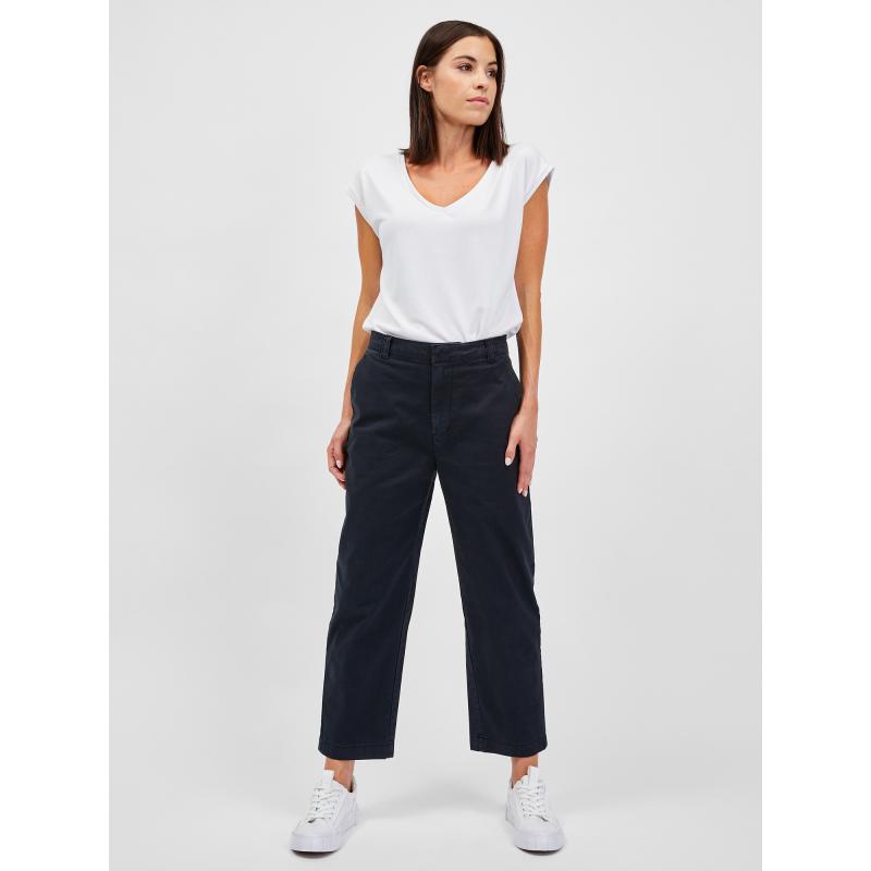 Dámské khaki kalhoty.Bavlněné s elastanem.Vysoký pas.Skryté zapínání na zip a háček.Přední šikmé kapsy.Zadní lemované kapsy.Kratší široké nohavice.Program Washwell. 97 % bavlna, 3 % elastan