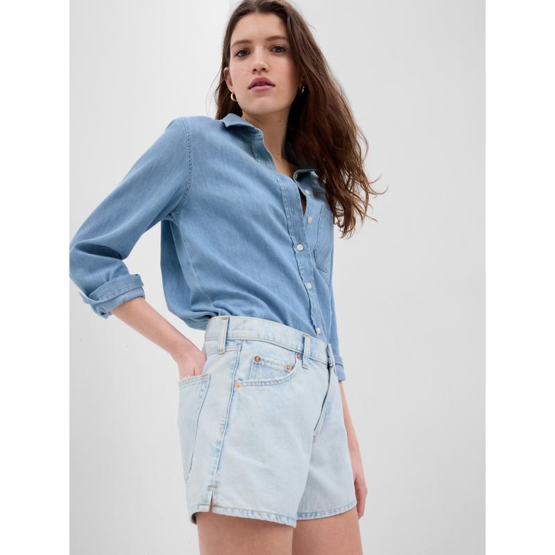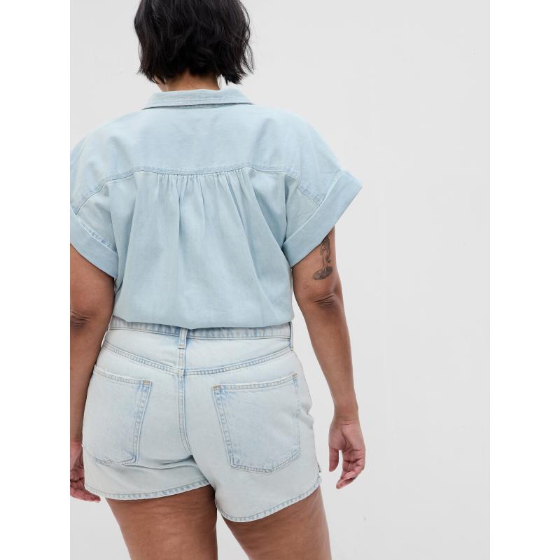 Dámské džínové kraťasy.S nízkým pasem.Pevný pas s poutky na pásek.Zapínání na knoflík a zip.Široký střih nohavic.Délka vnitřního švu 10 cm. 95 % bavlna, 5 % bavlna