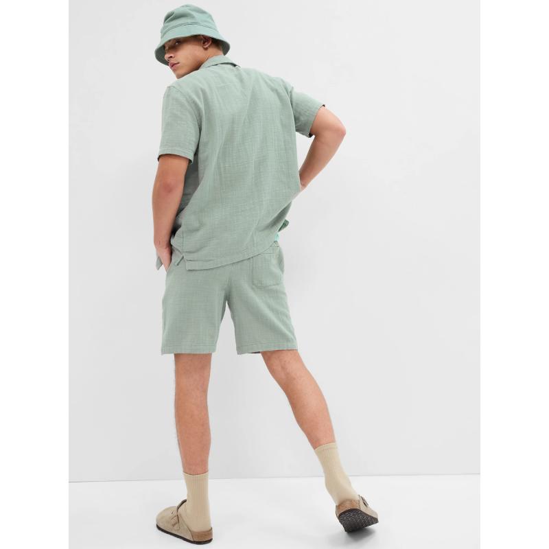 Pánské kraťasy z mačkaného mušelínu.Pružný pas se stahovací šňůrkou.Přední šikmé kapsy.Zadní kapsa.Volný střih nohavic.Délka vnitřního švu 20 cm. 100 % bavlna