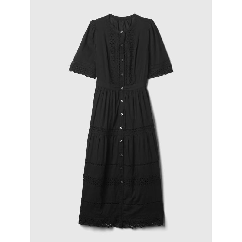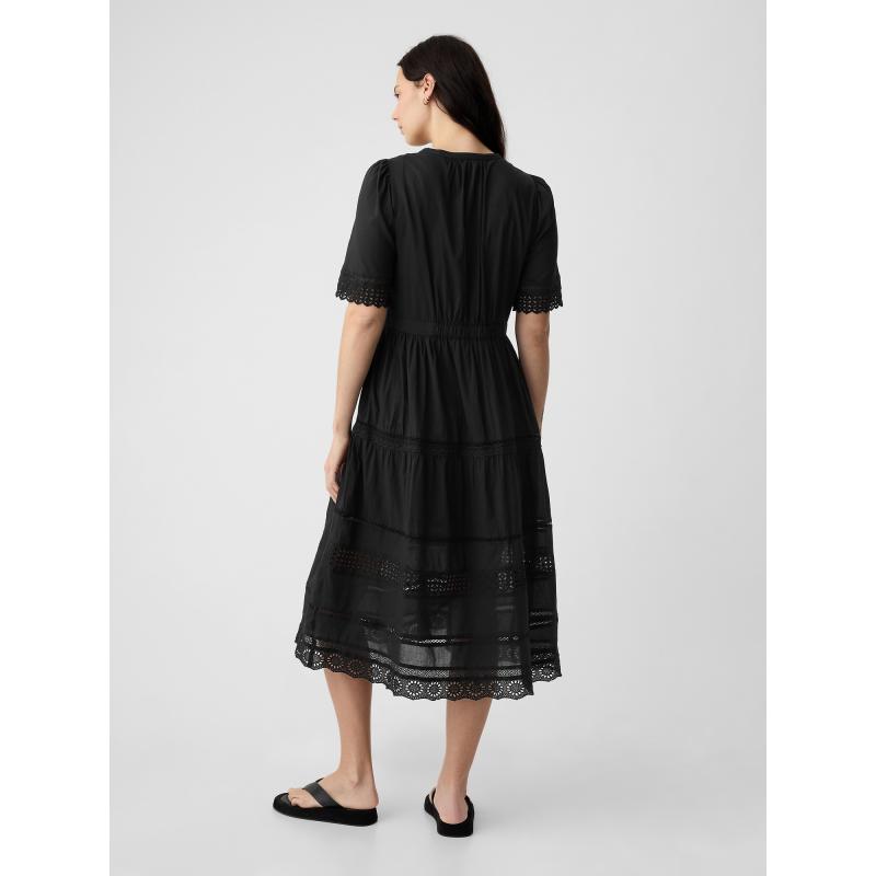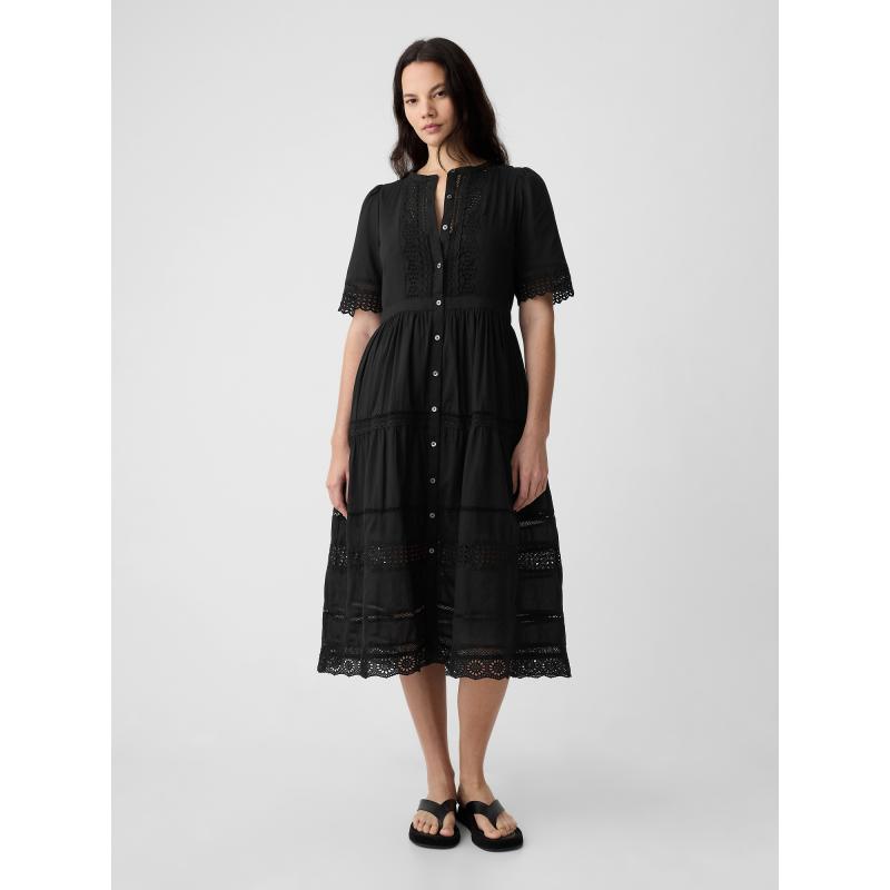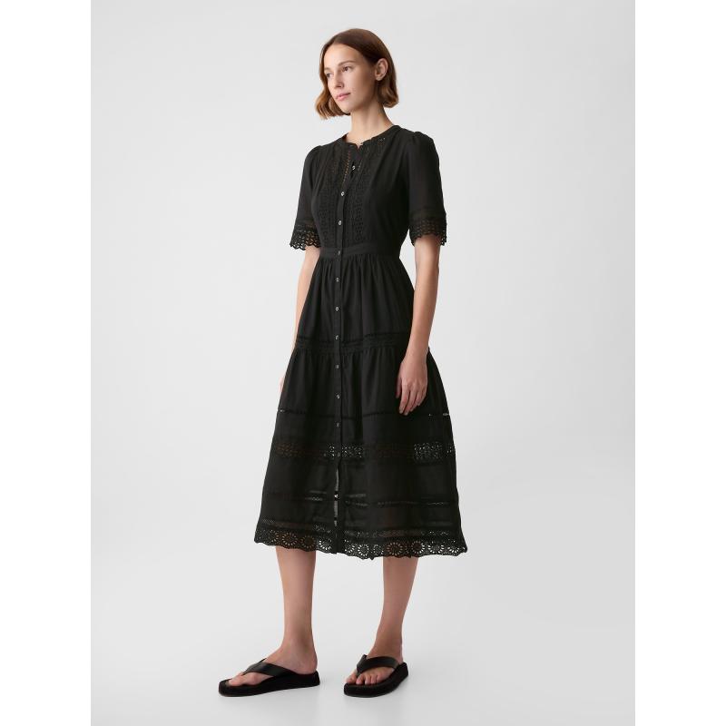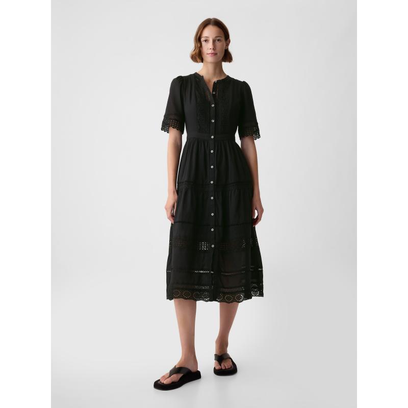 Dámské krajkové midi šaty.Výstřih ke krku.Zapínání na knoflíčky.Krátké nabírané rukávy.Pružný zvýrazněný pas.Modelka má na sobě velikost S.Míry: výška 180 cm, pas 66 cm, boky 97 cm 100 % bavlna