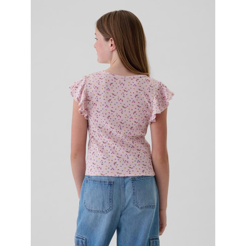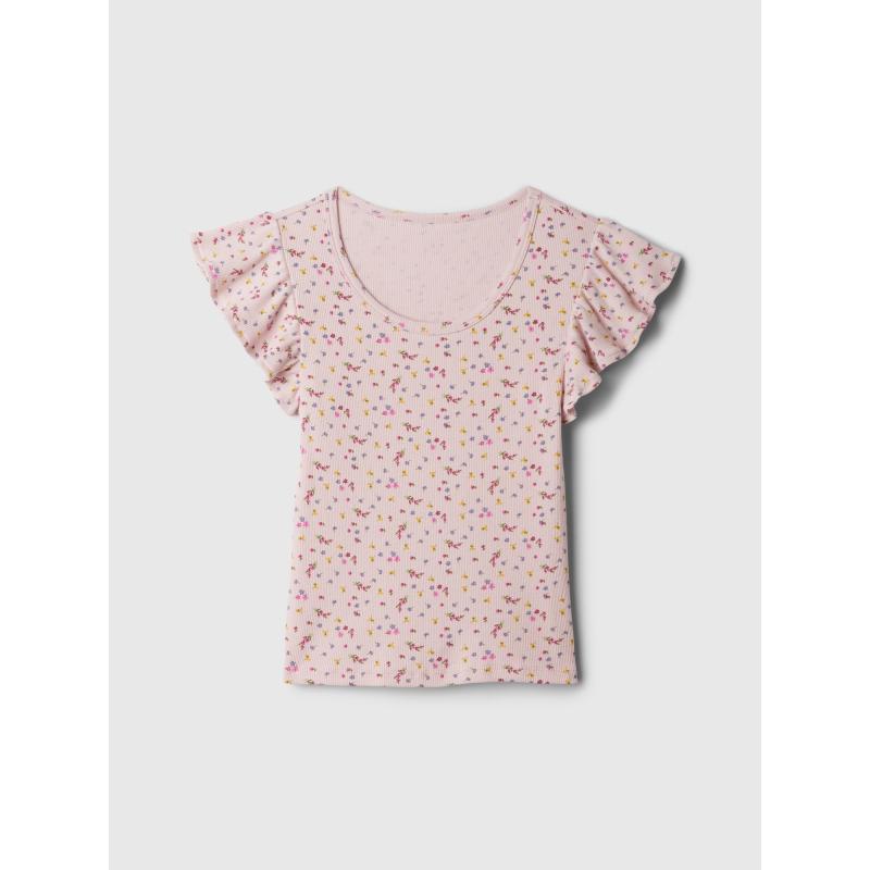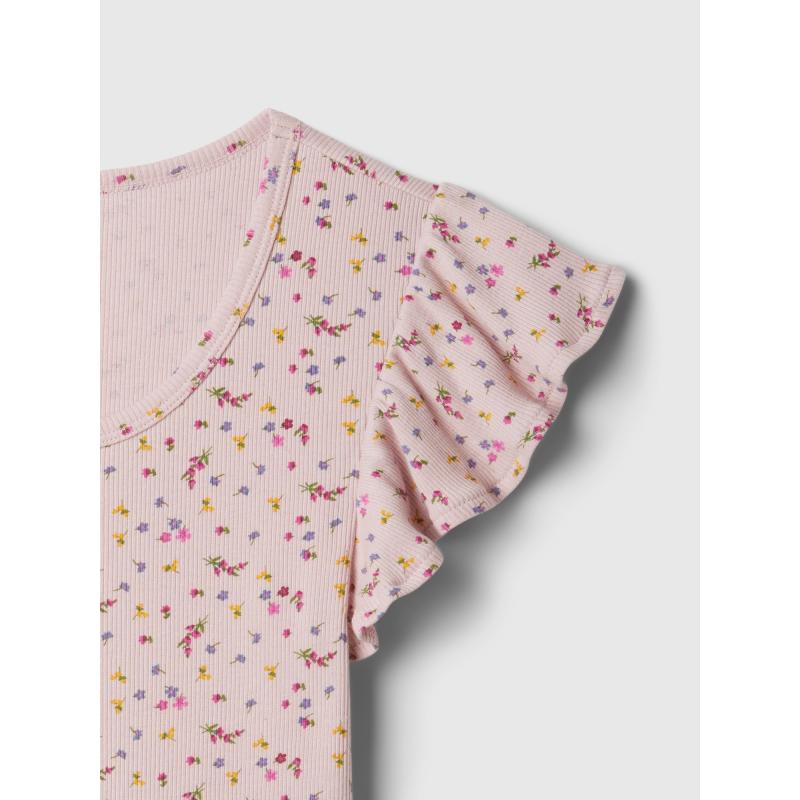 Dětské bavlněné žebrované tričko. Krátké volánkové rukávy. Úzký a pohodlný střih, který se dobře přizpůsobí postavě. Délka k bokům. 100 % bavlna
